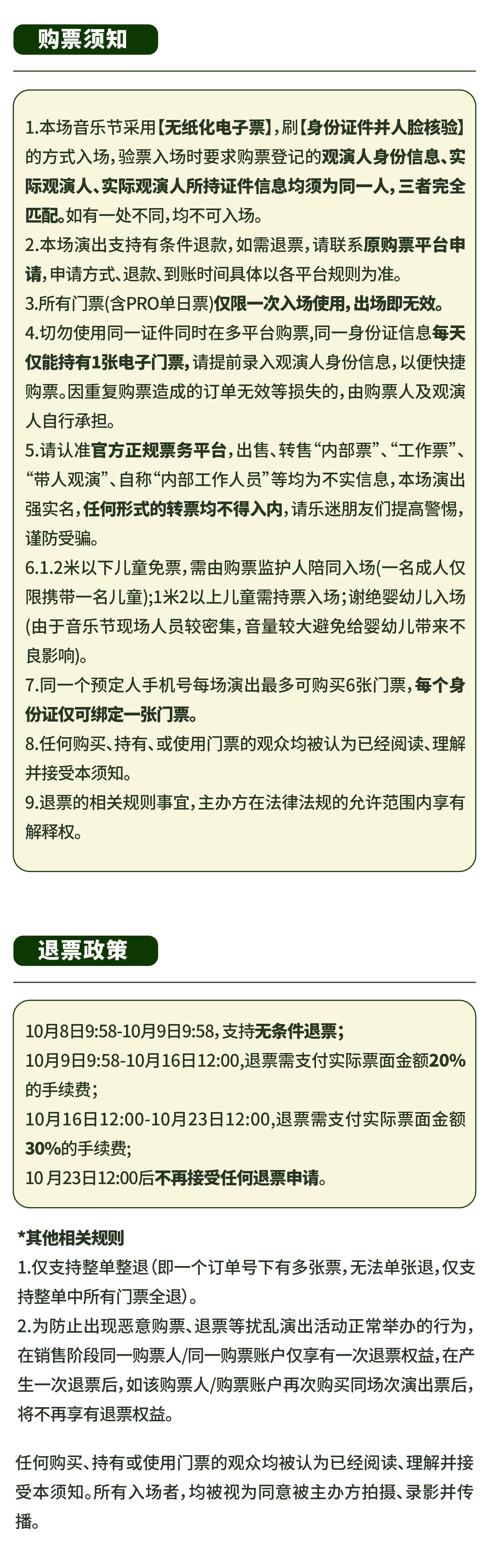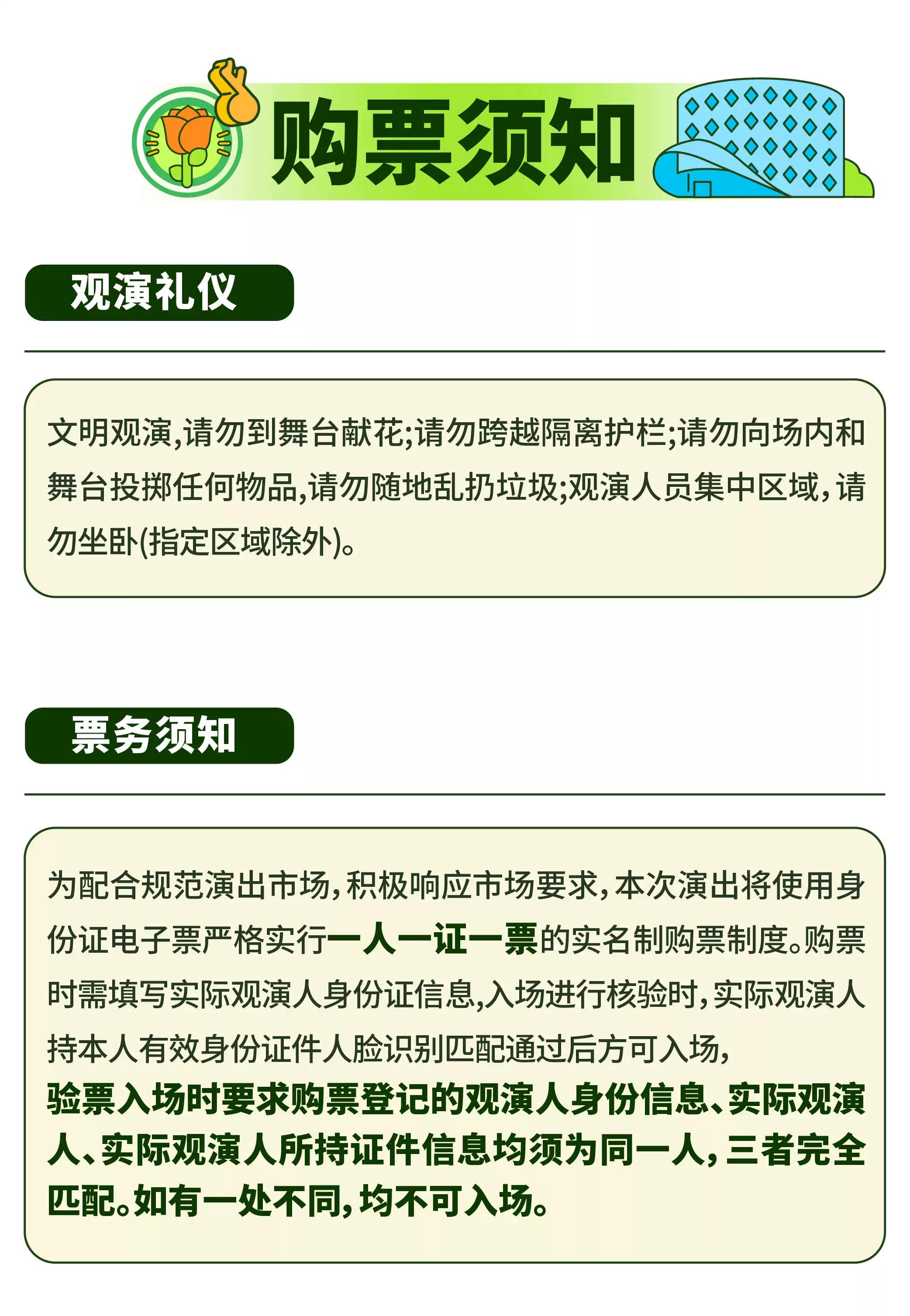 | 重要提示 | 演出现场气氛热烈,请您务必根据自身身体状况酌情是否购票参与观演,特别是患有心脏类疾病、急性心脑血管疾病、心肌炎、高血压等相关疾病的人群,请您务必遵照医嘱,结合病史及个人身体状况进行观演,观演期间请自行承担身体健康相关责任。 | 温馨提示 | 购买前请您提前规划好行程,做好相应准备,以免影响您的正常观演,感谢您的理解和配合。 若演出受不可抗力影响延期或取消,票牛将对演出票订单按照项目官方通知方案进行处理,其他因观演发生的费用需由您自行承担。 |