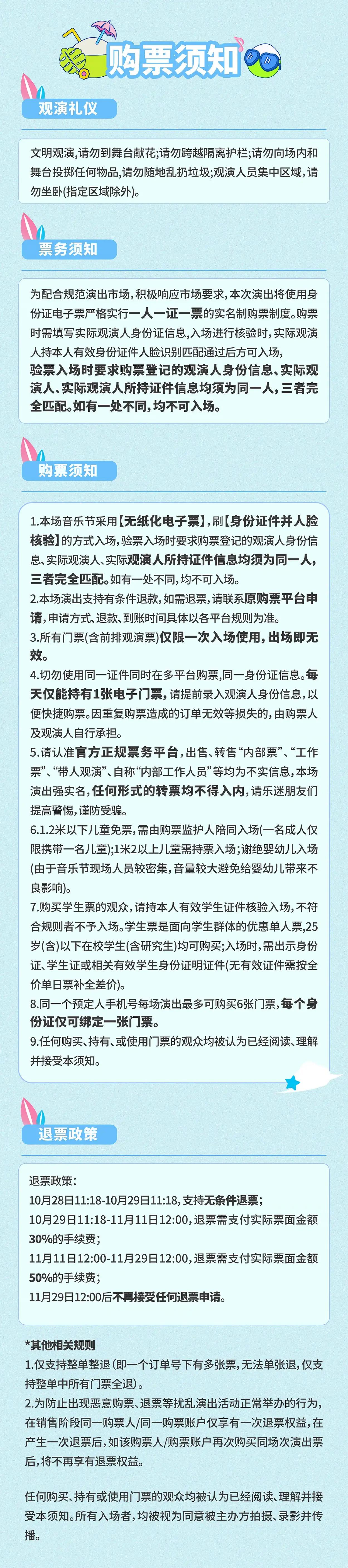 | 限购说明 | 每单限购6张 | 重复购票说明 | 同一位“实名观演人”请勿在多个售票平台重复购票,一位“实名观演人”的身份信息对应同场次的一张门票。 若同一位“实名观演人”被发现存在多个购票平台购买同场次行为,由该行为产生的无效重复订单、退票手续费、过期不可退票、无法入场等所有损失,均由购票人自行承担。 |