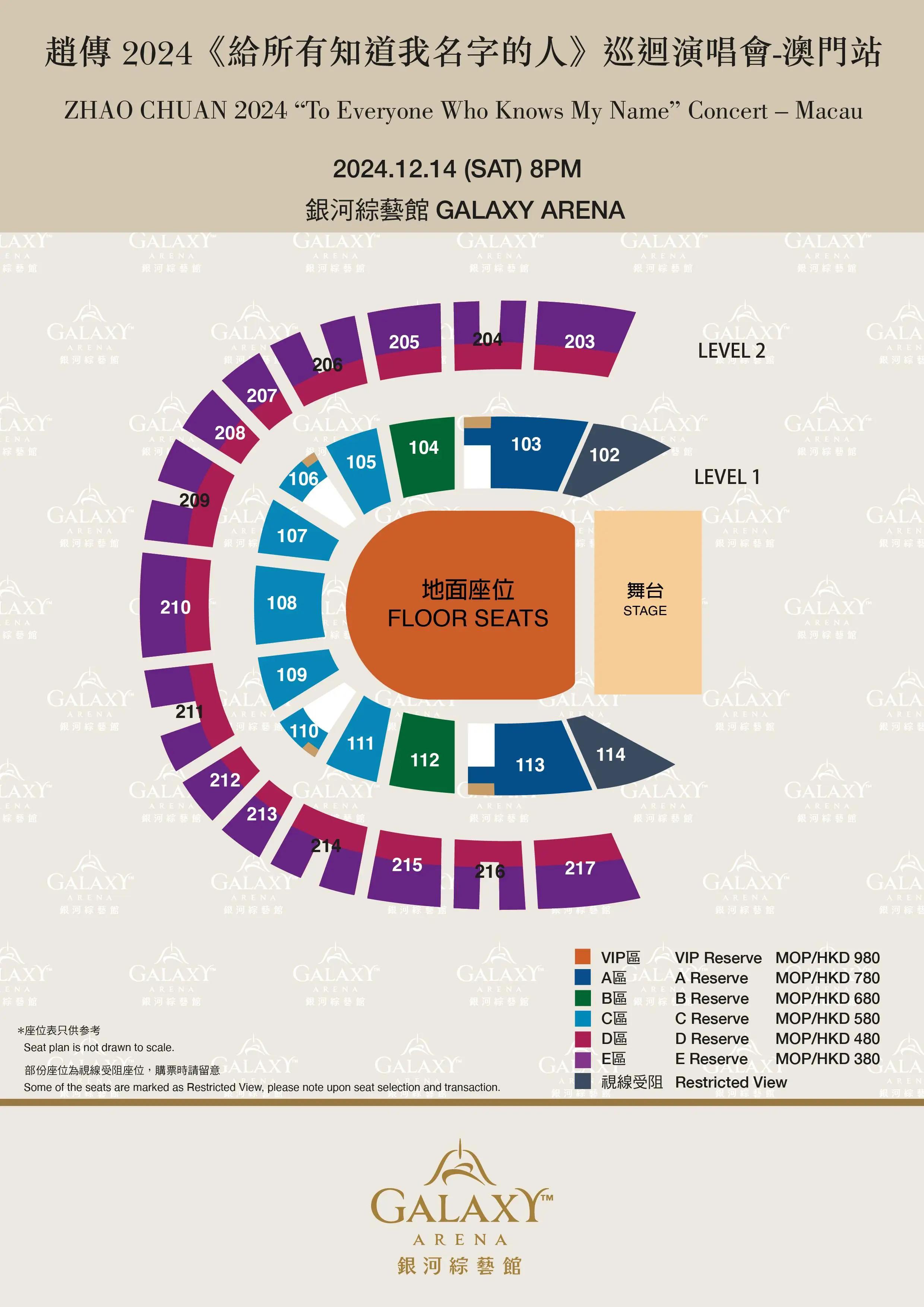 澳门币票价MOP:MOP980/ MOP 780/ MOP 680/ 580/ 480/ 380