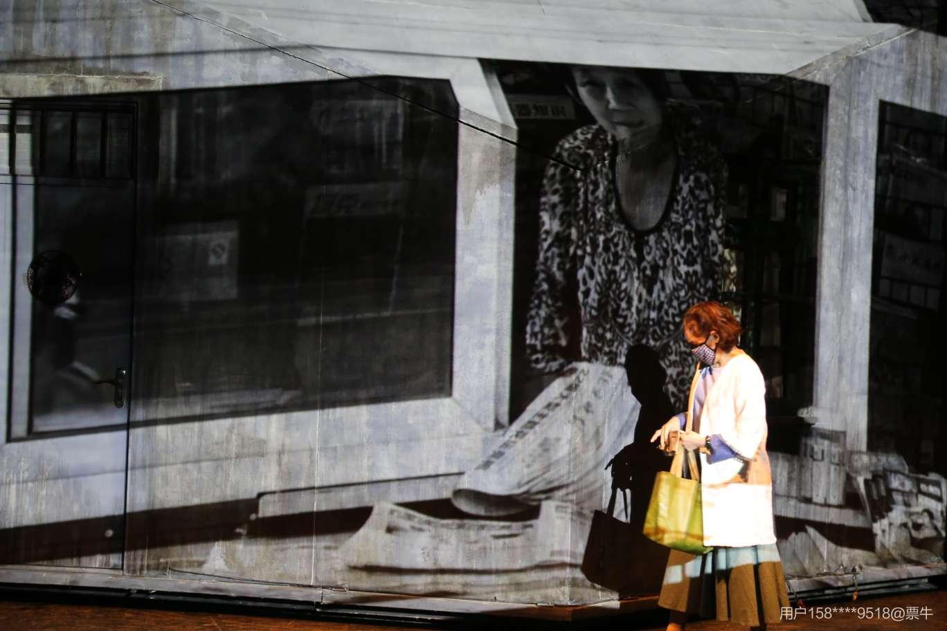 我觉得可以归纳出三类影像。第一类影像是投出过往年代的人物,用来追忆年华,比如:笑意盈盈踩着缝纫机的二十来岁的小顾,她踩着的不仅是缝纫机,更是踩着“年轻和美好”的云彩,这和现实的老迈和孤寂做强烈对比。第二类影像,是和73岁的老顾隔空演着对手戏的老伴儿(那个被离婚的老头),让事先录制的演员影像而非真人上台,影像和真人表演穿插融合,这真是前所未见的奇特安排。巧妙的表达出人物已经过世,而今已成虚幻;更是暗示岁月是多么残忍,连73岁老顾的这一段其实也已经是20年前的一份曾经了。第三类影像,则是播放的一些过往年代的图像来做年代感的铺陈渲染,也甚至用上了直白的字幕来直戳人心。