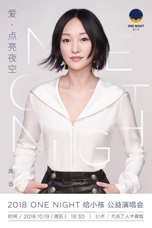 2014年,周迅参演关爱9种特殊儿童群体的公益电影《ONE DAY》,被影片中温暖励志的故事和公益理念打动,希望自己可以为孩子们做更多。随后,周迅创立"ONE NIGHT给小孩"公益项目,策划并主办一系列同名公益活动,并借助周迅及艺人朋友们的影响力,在每年暑期的7月中旬,以公益演唱会、公益探访等多种形式,集中传播,共同呼吁社会大众关注、关爱特殊儿童群体,为孩子们各尽所能,让他们享有与普通儿童一样美好的童年,给小孩无区别的爱。