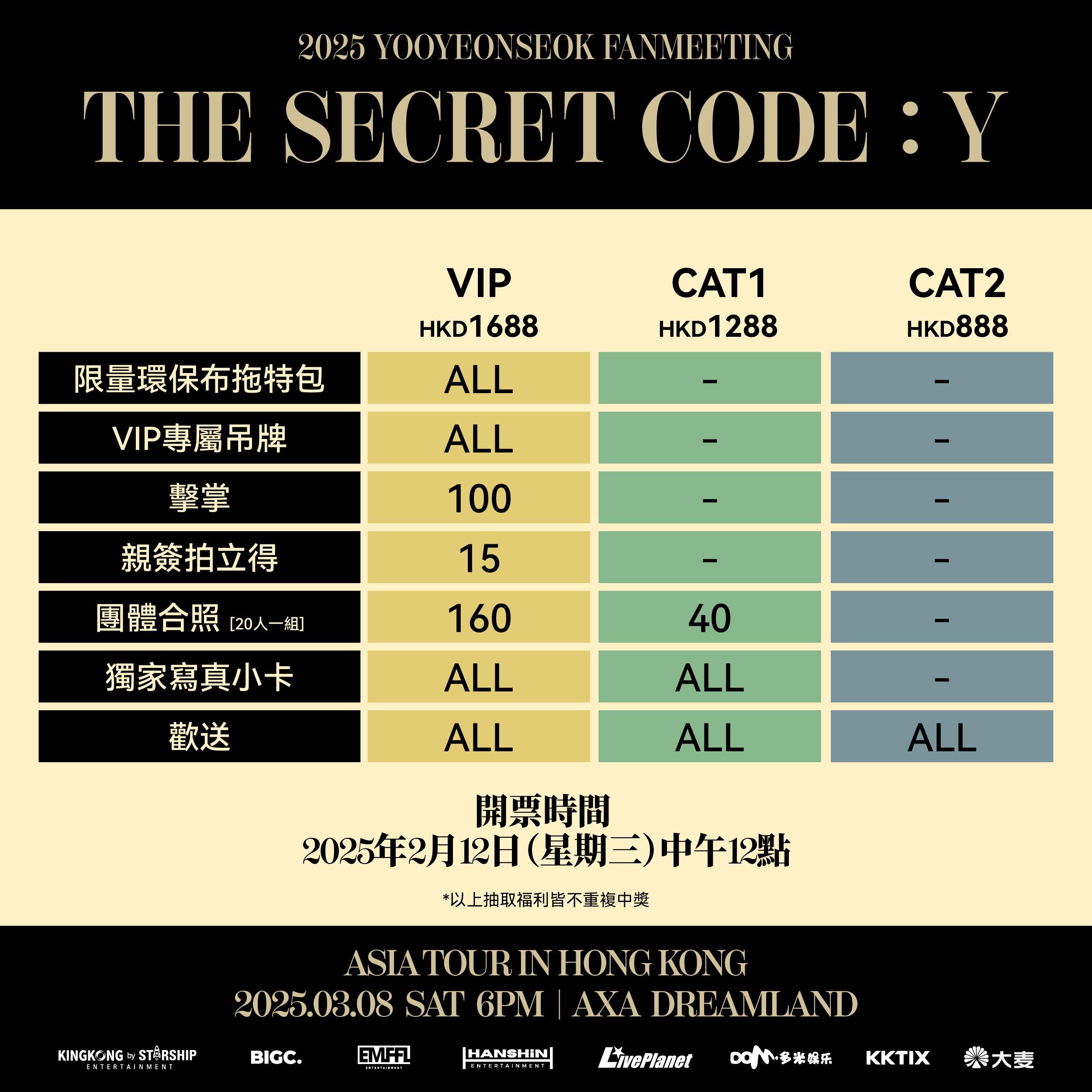 《The Secret Code: Y》是柳演锡首次举办的粉丝见面会巡演,通过这一全新企划,他将与粉丝们更亲密地互动。此次巡演将带领柳演锡与全球的粉丝们一同探索属于他的「秘密代码」。每一场见面会都将呈现柳演锡的多面魅力,结合独特的互动环节、未公开的幕后故事、专属表演以及粉丝互动,给所有参与的粉丝带来一场难忘的感官盛宴。