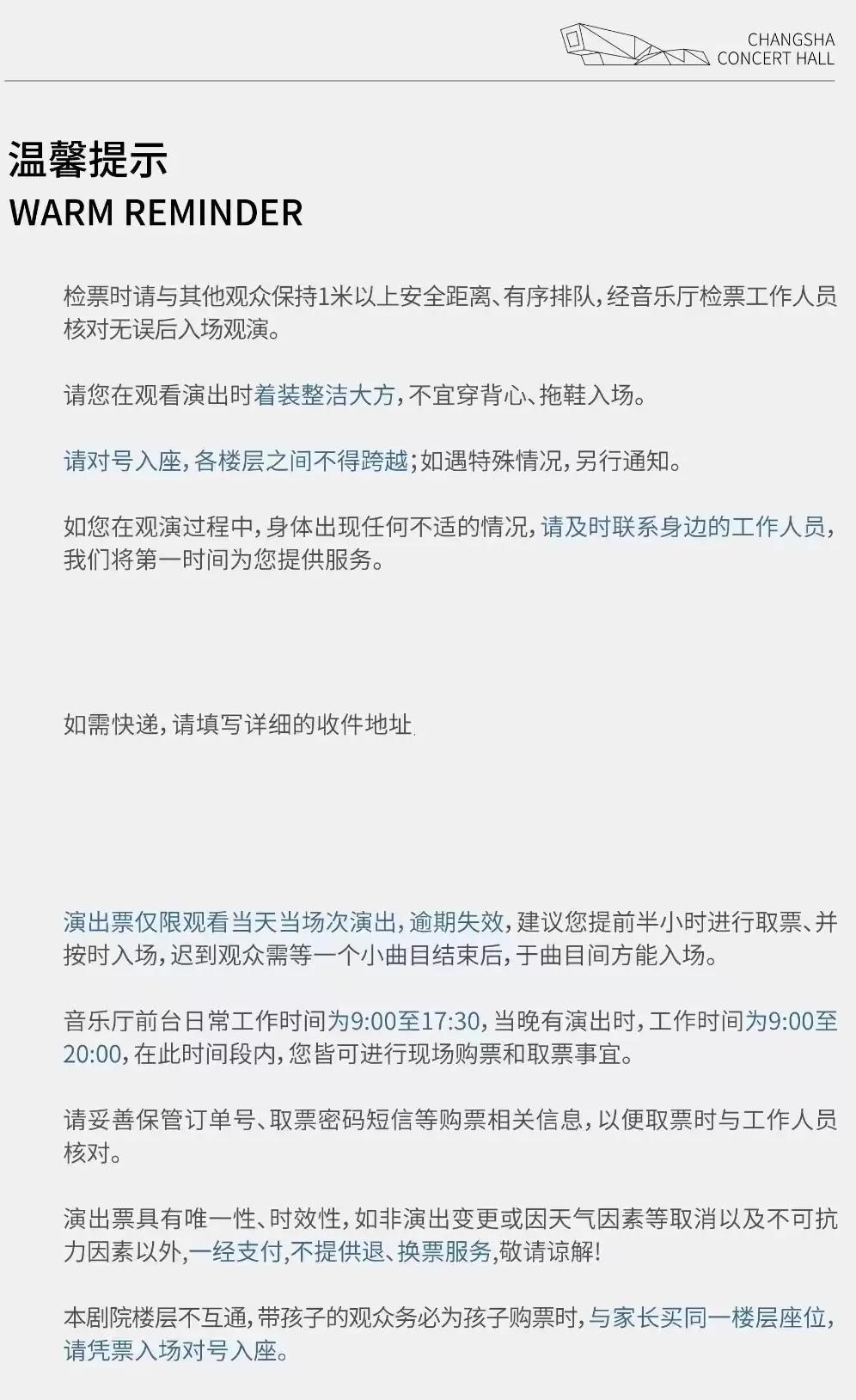 | 电子票 | 本项目支持凭电子票入场。 -请至少提前一天购买,开演前24小时内,票牛会发送取票短信,请按短信提示内容取票。 |