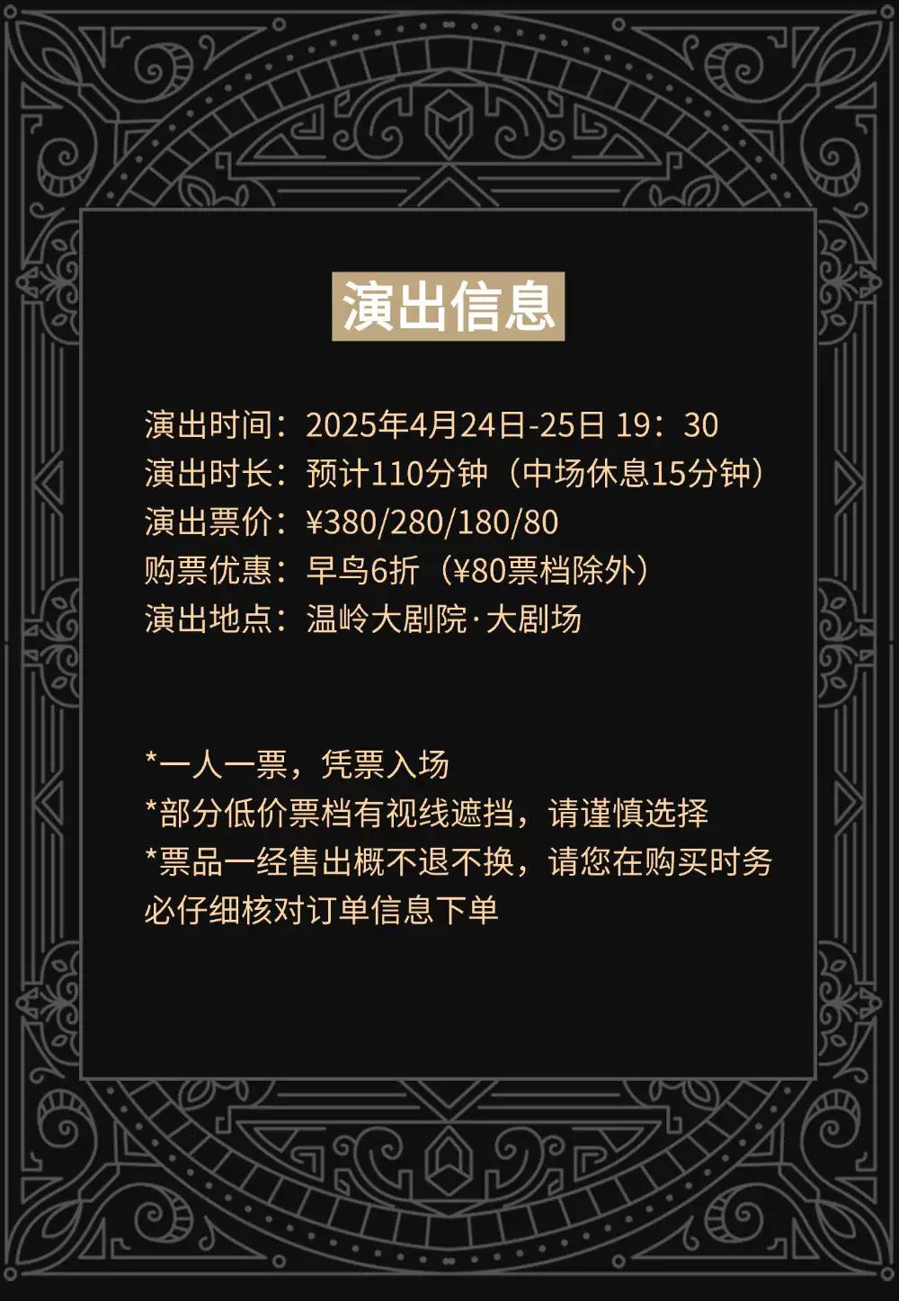*请合理安排您的行程,购票时请确认演出时间、地点、座位及优惠信息,演出票一经售出,概不退换。请斟酌购买。