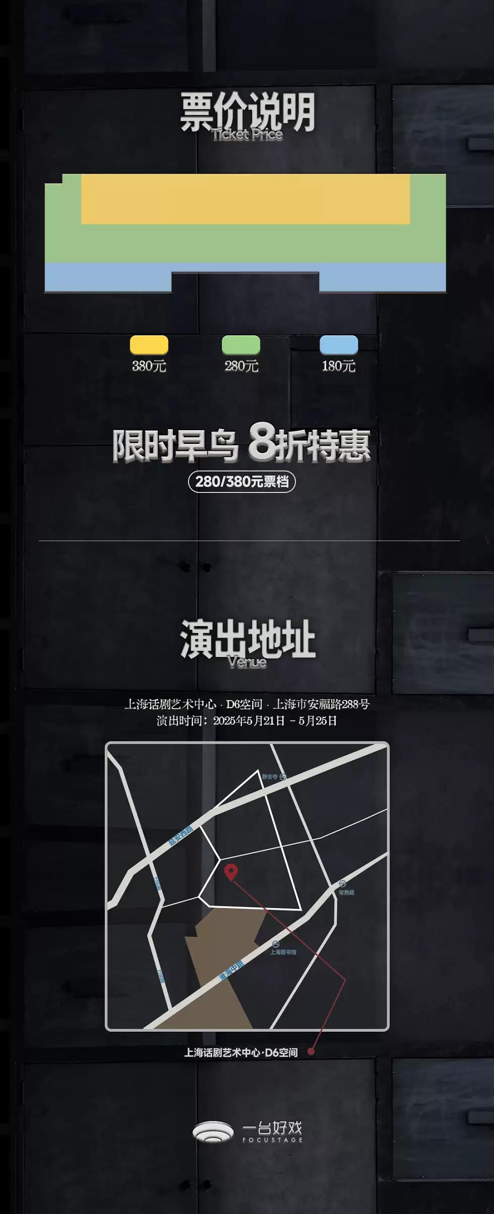 | 座位类型 | 请按门票对应座位,有序对号入座 | 儿童入场提示 | 儿童一律凭票入场,本剧建议16岁以上观众观看 |
