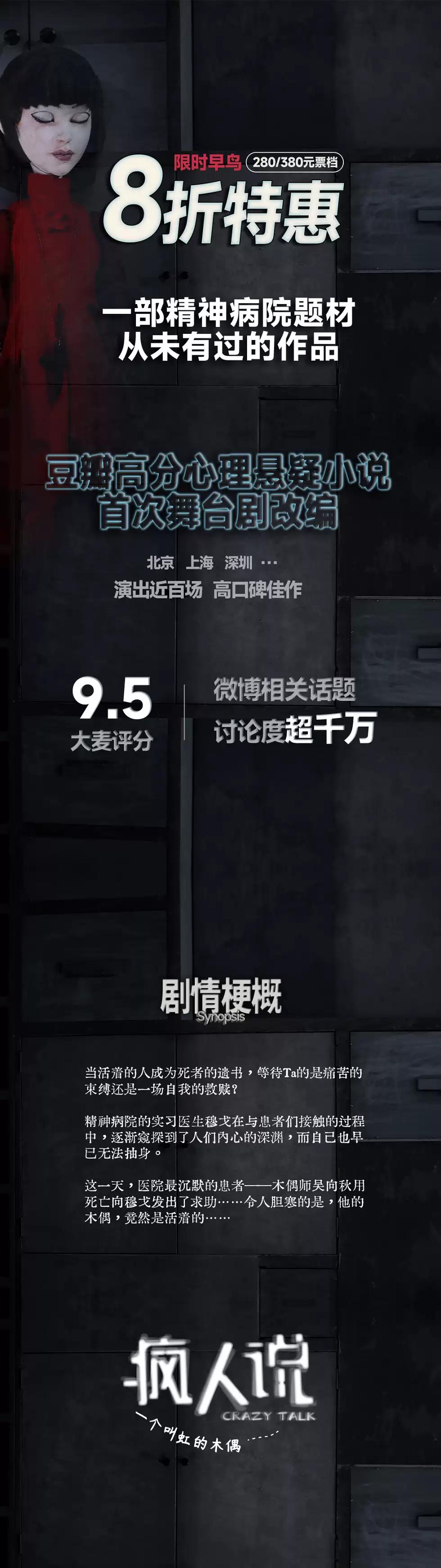 *演出中将会出现道具人偶,可能会触发“恐怖谷效应”,若您对与人类相似度较高的非人物体感到恐惧请谨慎购票 *演出中可能出现关于自杀、精神控制等问题的探讨