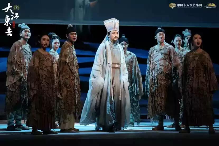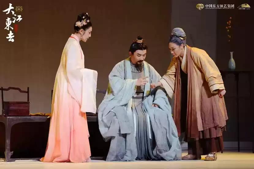音乐剧《大江东去》着眼于苏轼在黄州脱胎换骨成为苏东坡的这段经历。在黄州,他稳稳地站在了质朴的大地上,站在了平凡的民众间,站在了中国文化的根基上,站在了满怀大爱的心怀里。在黄州,他从观心,到洗心,到安心,脱胎换骨,涅槃重生臻于空灵之境。如大江东去,浩荡而磊落;如一蓑烟雨,旷达而欢喜……