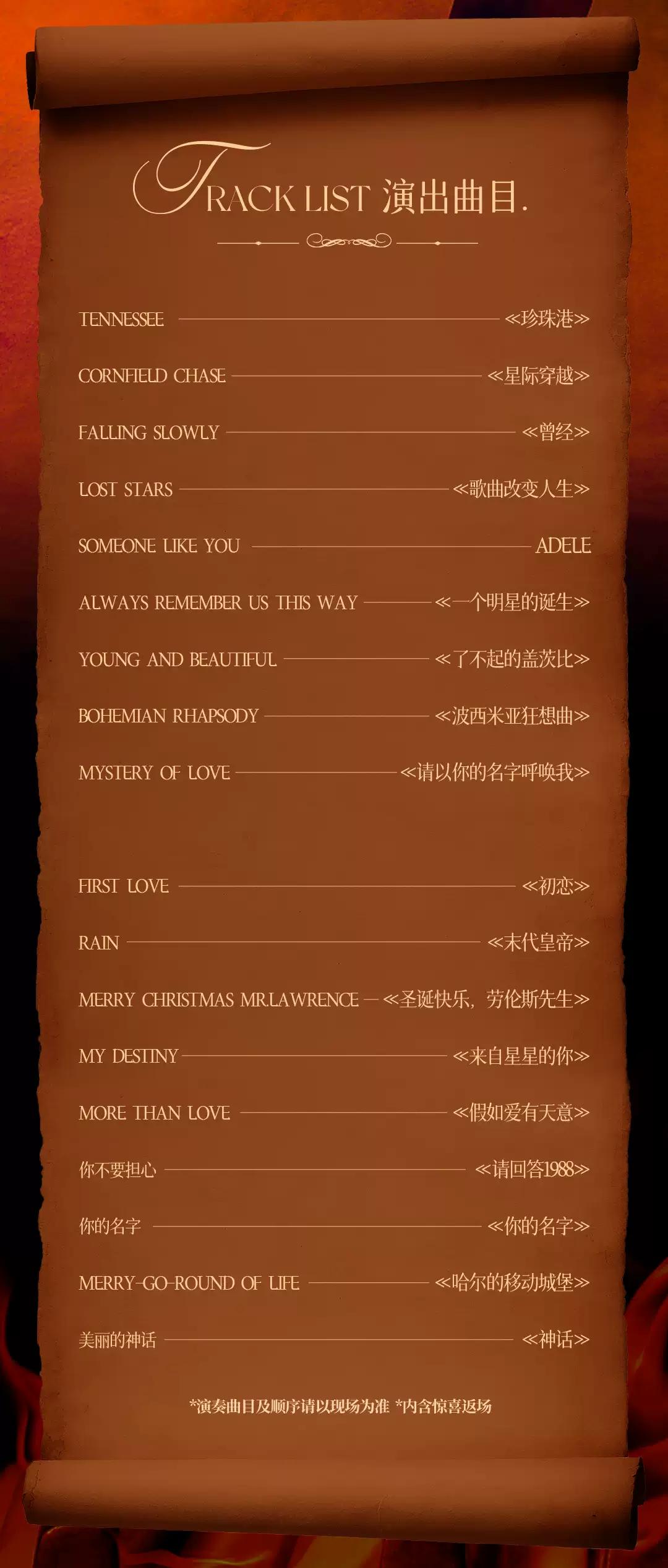 | 禁止携带物品 | 食品、饮料、相机、充电宝、打火机等 | 发票说明 | 如需开具发票,请在演出结束后一个月内联系客服并提供开票信息:票款发票由商家开具,平台服务费发票由票牛开具。 |