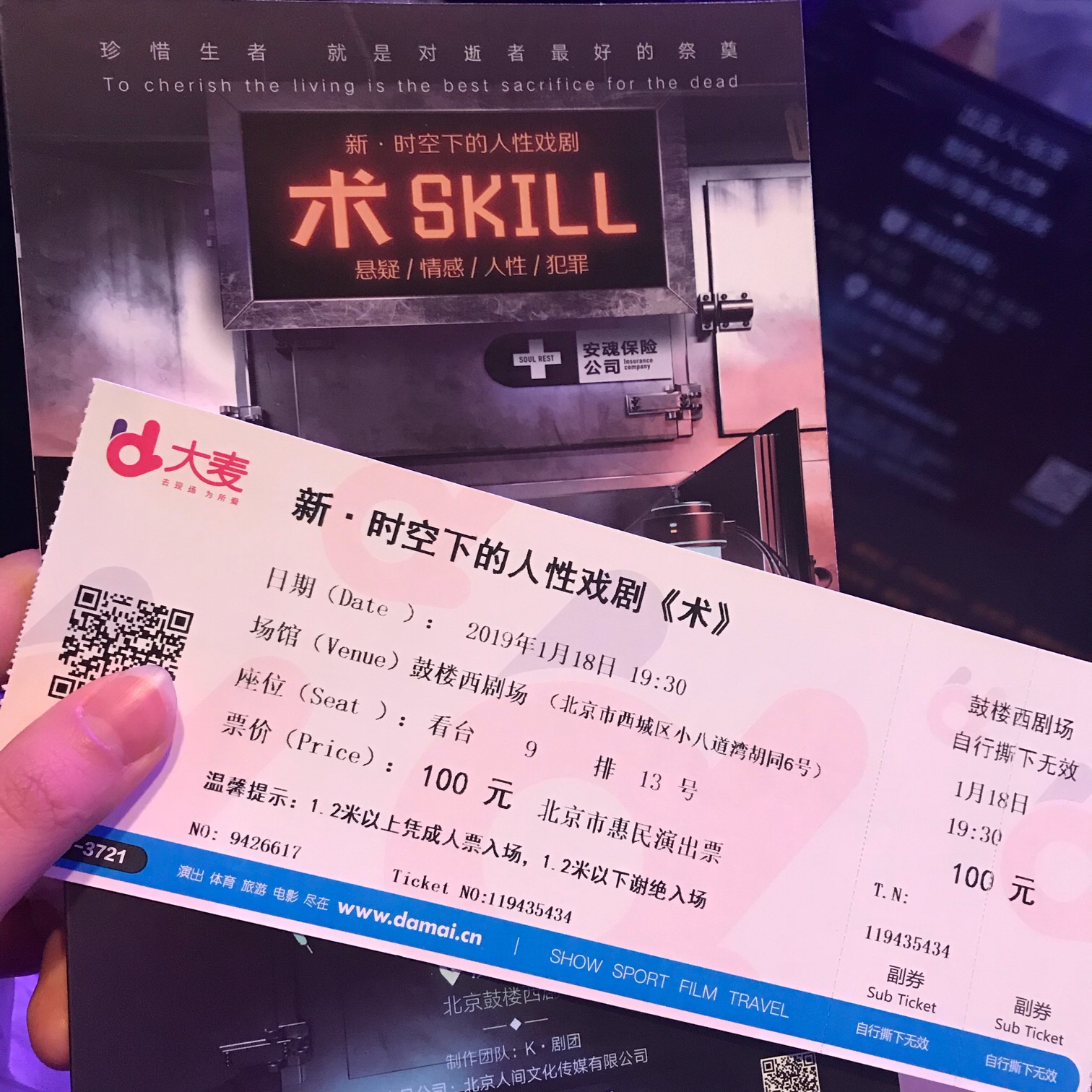 Lv4昨天看了悬疑舞台剧《术skill》。这是是本剧第二次演出,还在磨合之中所以稍有不好的地方也可以理解。表演上与昨天的某些方面稍有变动。比如说劫匪劫持杀警长的那段,并没有表达清楚,死的明不白,我觉得如果按上次的方法演会更好一些。表演开始上来三位主演们就唱了一段rap很带感,把自己的安魂保险公司业务和他们所做得事情介绍了一遍。提到了“术”,就是本剧的题目,它是一个能让人在死后在另一个活人身上一时层面再活三分钟的技术。(至于为什么起这个名字,我就不剧透啦~由你们去寻找答案吧~)同时提出了他们的理念:“对生者的珍惜,就是对死者最好的祭奠。”整部剧有一种白夜追凶的感觉,尤其是男主,很帅,演技杠杠的,玩魔方也很6。说到魔方,它在本剧中仿佛多次的出现,用其他剧评人的话说:“按剧情的角度出发,魔方就像人生会有不同的转变不同的轨迹会遇到不同的人,学会珍惜,不留遗憾。”女主很厉害,一人分饰两角都演的很像。警长,捺,能看出来是截然不同的两个人。中间每一幕都会插一小段黑白VCR给人留以悬念,还有不时插一段音乐,感觉像是蜂巢和繁星的集合体。前半部分可能还是因为演出场次少的原因,感觉演员也没有入戏很深。歌曲放的地方也有些拖剧情,但当高潮来了之后使我对整部戏都有了改观。我觉得这剧可以考虑变成个电视剧,舞台剧两个小时看的时候但总感觉有的地方没讲完,或者说剧情有点儿紧凑?但故事真的很棒!推荐~舞台不错,简单实用。加上灯光可以给满分。这部剧现在还在磨合期,如果你们想看的话,我觉得可以考虑买靠后的日期,这样表演上和剧情上都会更常熟一些。用户156****5023-CtWIALv42019-01-123回复5赞- Lv4