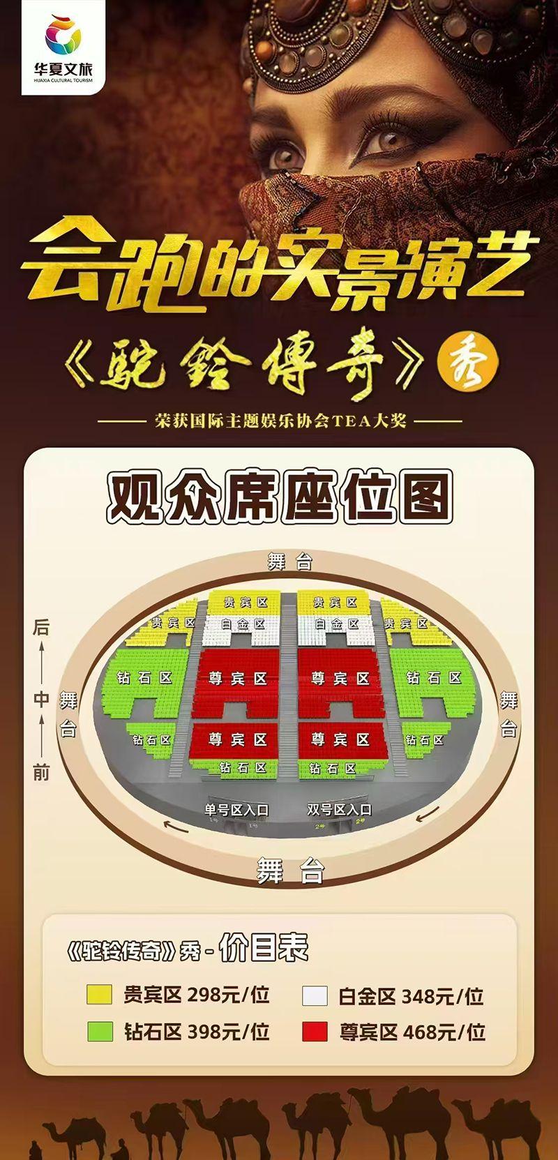 会跑的实景演艺《驼铃传奇》秀,在编撰《驼铃传奇》秀的过程中,以"一带一路"为主线,深入挖掘大唐传统文化,追寻驼队丝绸之路上的踪迹,以正能量传播西安最辉煌历史时期的文化传奇。整场演艺分为序幕《岁月再现》及《送君千里》、《狼道遇险》、《异国风情》、《祥雨洗尘》、《迎郎归来》、《华夏盛世》七幕剧情,以"好看、好听、好玩“为宗旨,打造出一部面向大众、雅俗共赏、喜闻乐见、大快人心的演艺。演出情节设计以一对新婚燕尔的夫妻《送君千里》依依借别开场,讲述西行驼队一路经历火山、雪崩、风沙、大漢等自然险阻以及狼群突袭,九死一生;随后满载货物返程,途中祈福巴米扬,巧遇天降圣水,在亲人的期盼中安然回到长安,期间也穿插描述异域风土人情;整场演出跌宕起伏,为观众带来震撼、刺激、唯美、欢快的视听感受,使用发明专利多达47项,骆驼、苍狼在其中也有惊险刺激的表演。《驼铃传奇》秀带你穿越大漠风沙的豪迈与苍茫,倾听丝绸之路上悠远驼铃的清脆与神秘,品味异域风情,见证荣耀大唐,聆听华夏干年回响。
