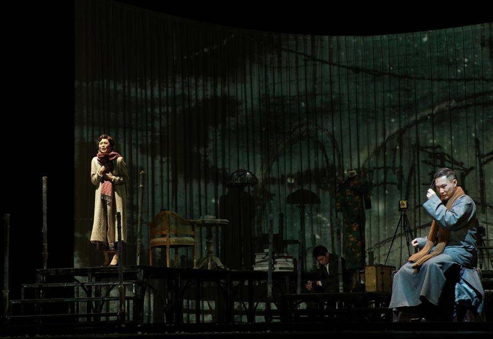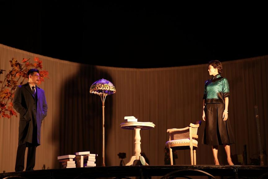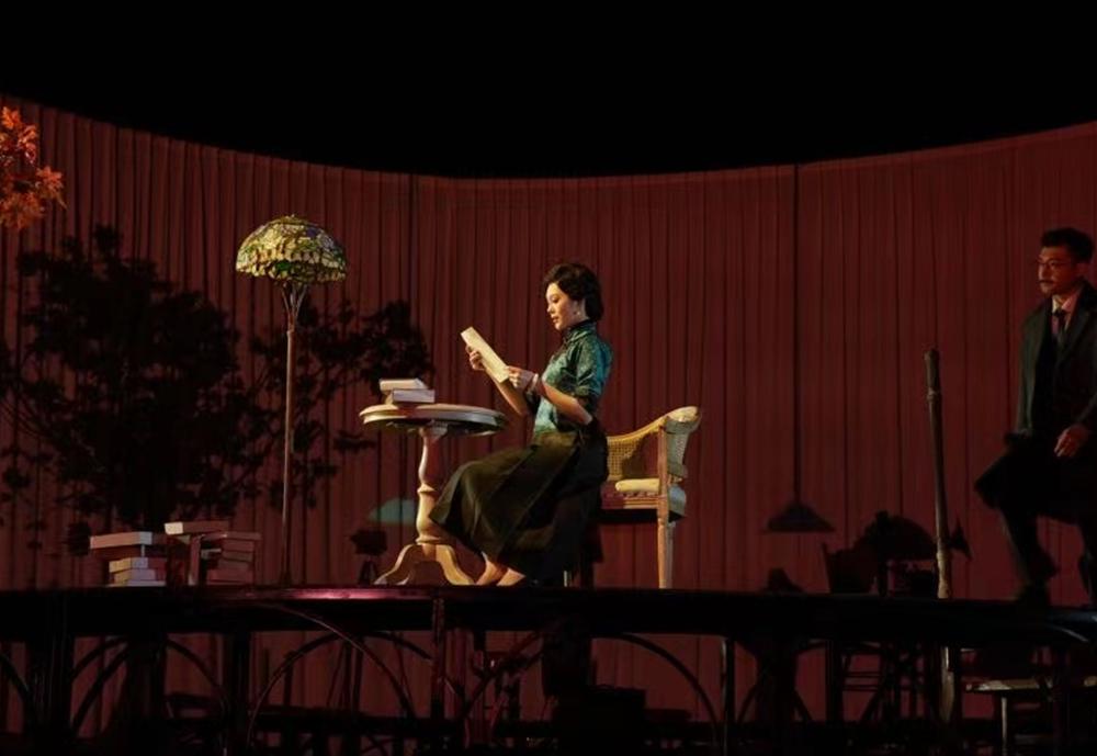 当舞台上另一层架高了的铁台轮转起来时,《半生缘》里的顾曼桢与沈世钧在大雪纷飞里断了联系,那一封封寄出的信件变成一片片洒满舞台的雪花,满目凄迷;《红玫瑰与白玫瑰》里的佟振保拿着苹果,与王娇蕊眉目留情;《小团圆》里的盛久莉与邵之雍在琉璃灯前签下一纸婚约,“愿使岁月静好,现世安稳”……