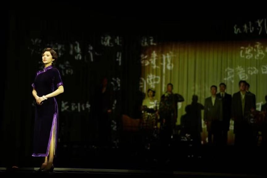 舞台上的作家张爱玲,由浙话青年演员刘妙饰演,剧中的她一袭旗袍,优雅妩媚,其逝去岁月的风姿伴随着张爱玲的经典名篇、经典名句呈现在观众面前,令人动容。