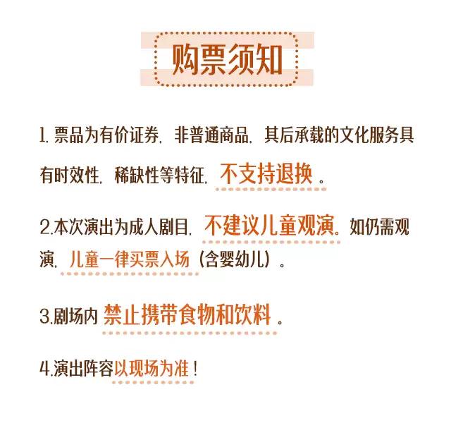 - 1.购买前请您提前规划好行程,做好相应准备,以免影响您的正常观演,感谢您的理解和配合。2.若演出受不可抗力影响延期或取消,大麦将对演出票订单按照项目官方通知方案进行处理,其他因观演发生的费用需由您自行承担。