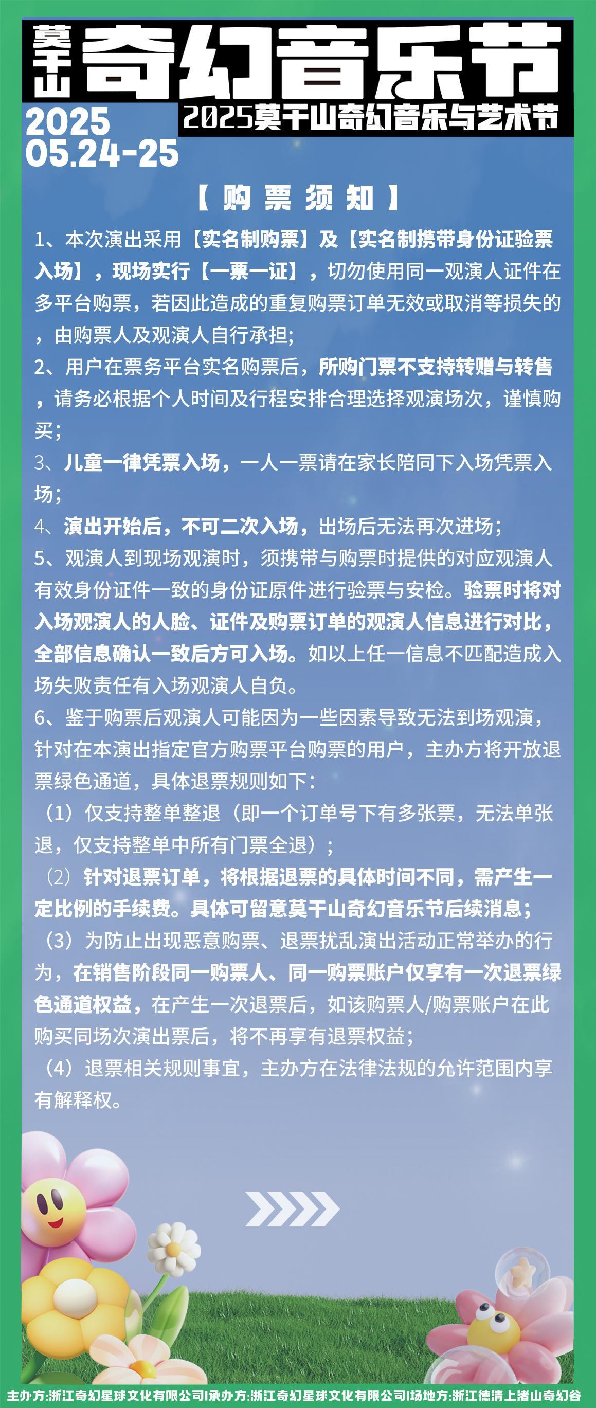 | 限购说明 | 每单限购6张 | 重复购票说明 | 同一位“实名观演人”请勿在多个售票平台重复购票,一位“实名观演人”的身份信息对应同场次的一张门票。 若同一位“实名观演人”被发现存在多个购票平台购买同场次行为,由该行为产生的无效重复订单、退票手续费、过期不可退票、无法入场等所有损失,均由购票人自行承担。 |