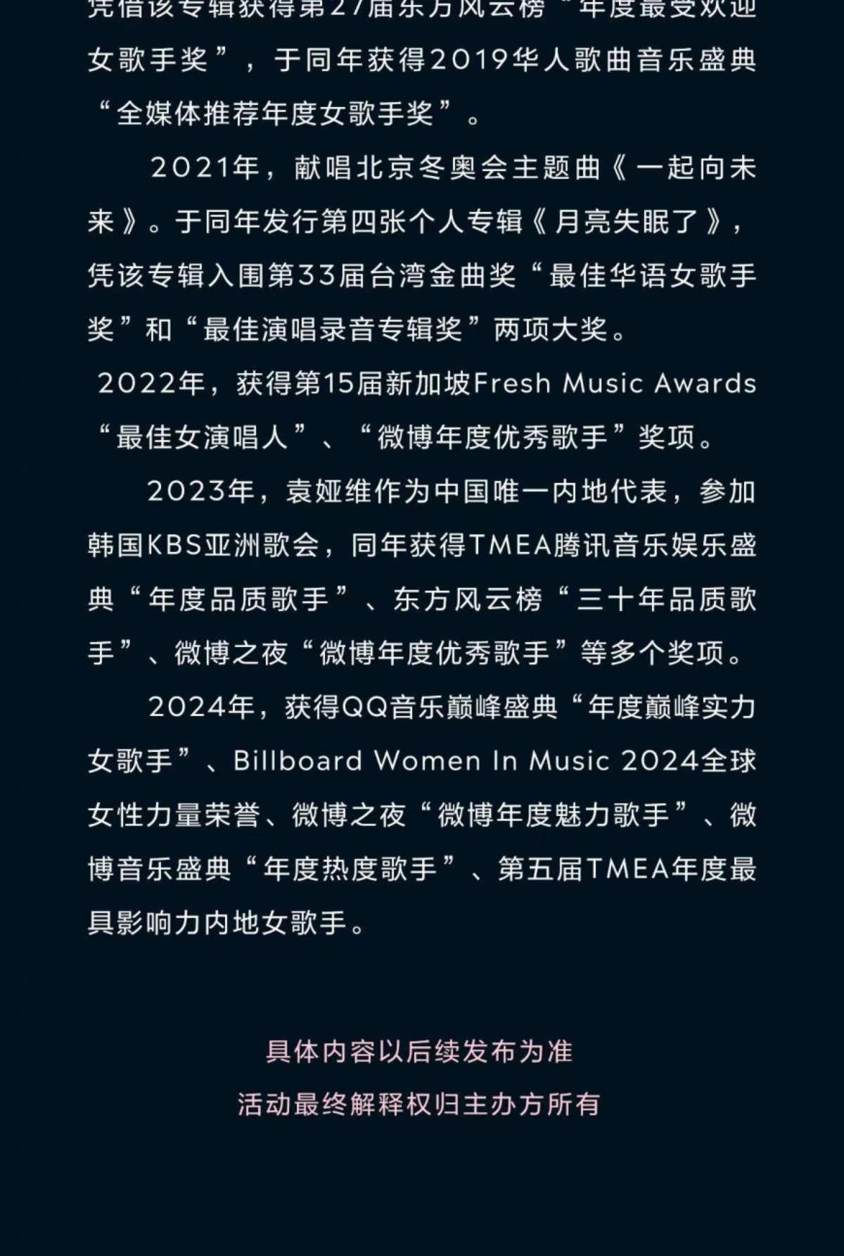 | 限购说明 | 每单限购6张 | 重复购票说明 | 同一位“实名观演人”请勿在多个售票平台重复购票,一位“实名观演人”的身份信息对应同场次的一张门票。 若同一位“实名观演人”被发现存在多个购票平台购买同场次行为,由该行为产生的无效重复订单、退票手续费、过期不可退票、无法入场等所有损失,均由购票人自行承担。 |