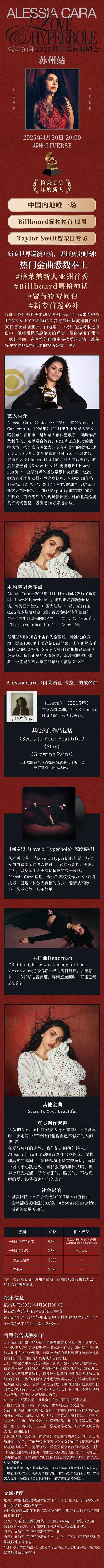 | 限购说明 | 每单限购6张 | 重复购票说明 | 同一位“实名观演人”请勿在多个售票平台重复购票,一位“实名观演人”的身份信息对应同场次的一张门票。 若同一位“实名观演人”被发现存在多个购票平台购买同场次行为,由该行为产生的无效重复订单、退票手续费、过期不可退票、无法入场等所有损失,均由购票人自行承担。 |