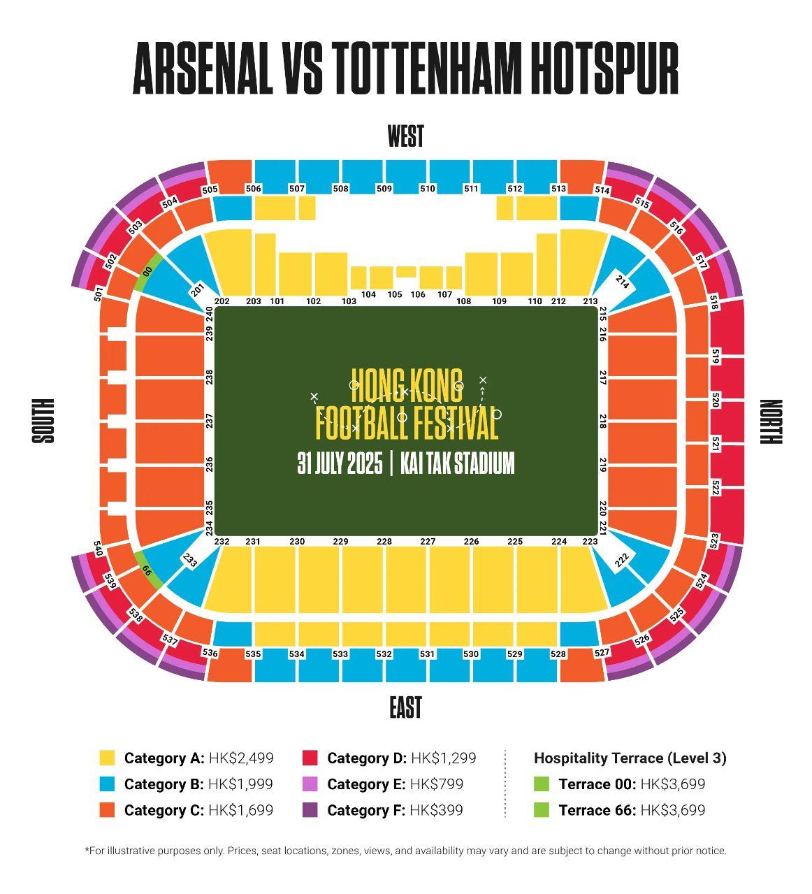 阿森纳与热刺将在启德体育场分别举行公开训练,票价从 HK$99至HK$299不等。热刺公开训练
