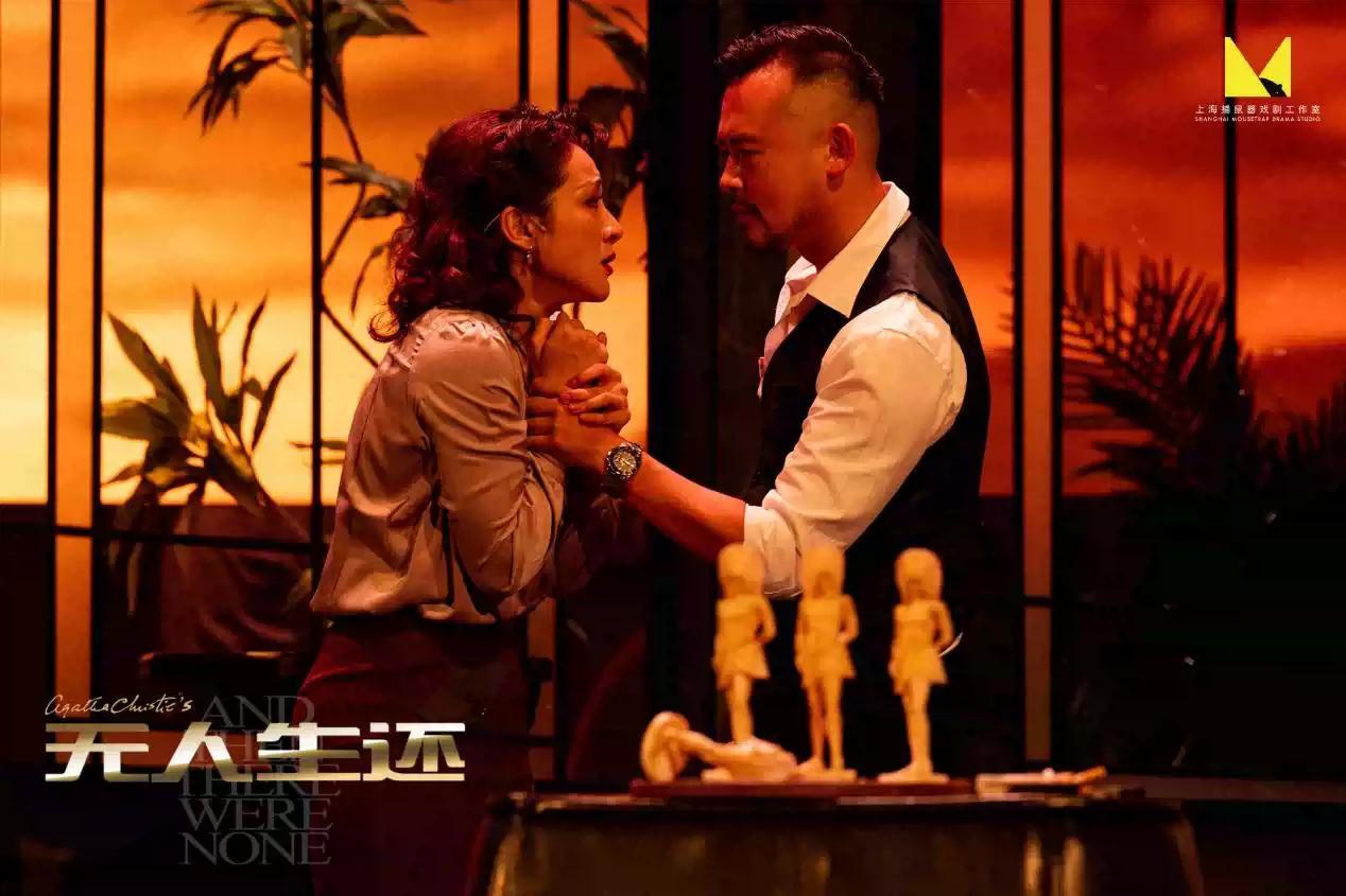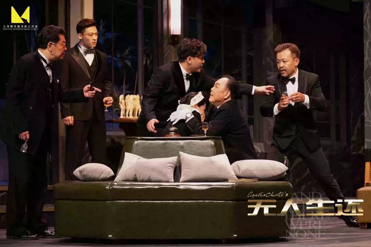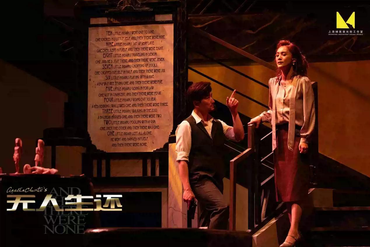 密闭的大剧场里,孤岛、悬崖、别墅应有尽有,旋转楼梯、玻璃大门、巨型吊灯精致大方。随着恐怖童谣在留声机里响起,剧中人物接二连三地突然死亡,在音效和灯光的默契配合下,悬念和恐惧向人频频发难,将故事和推理慢慢带向高潮。台上,一场“谋杀”正在进行,可凶手却迟迟没有现身;台下,空气开始凝重,气氛越来越诡异紧张。