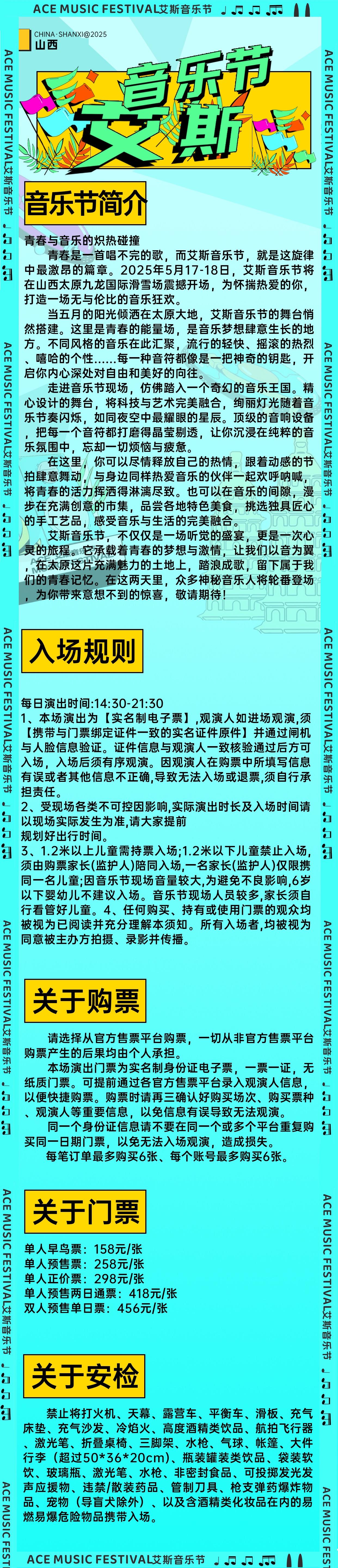 | 儿童入场提示 | 1.2米以上凭票入场,1.2米以下谢绝入场 | 禁止携带物品 | 食品、饮料、相机、充电宝、打火机等 |