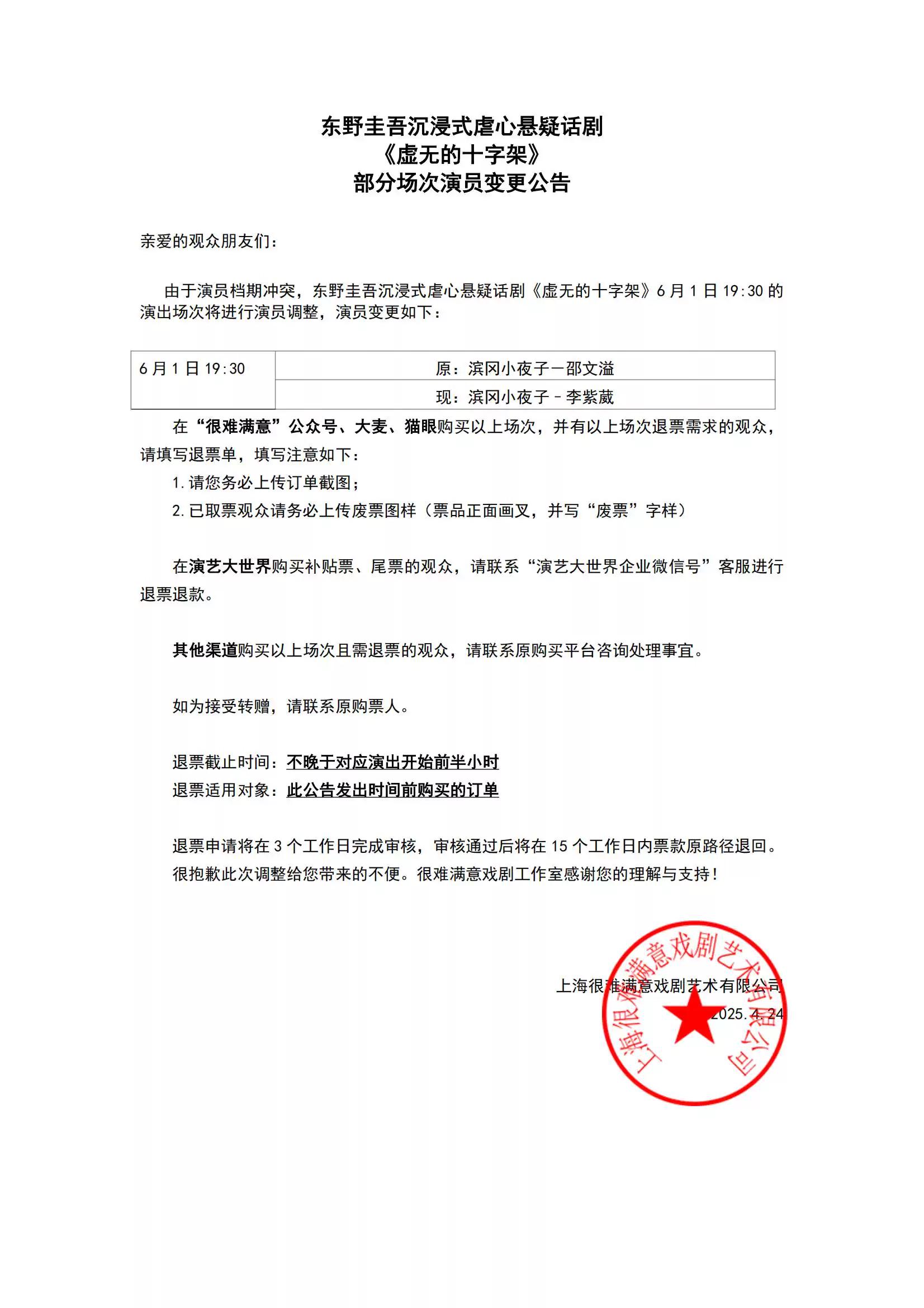 亲爱的观众朋友,票品是特殊有价证券,其背后承载的文化服务具有时效性、稀缺性,不支持退换。因个人因素导致无法入场,我们将无法做退换票处理。给您带来不便,请您谅解~