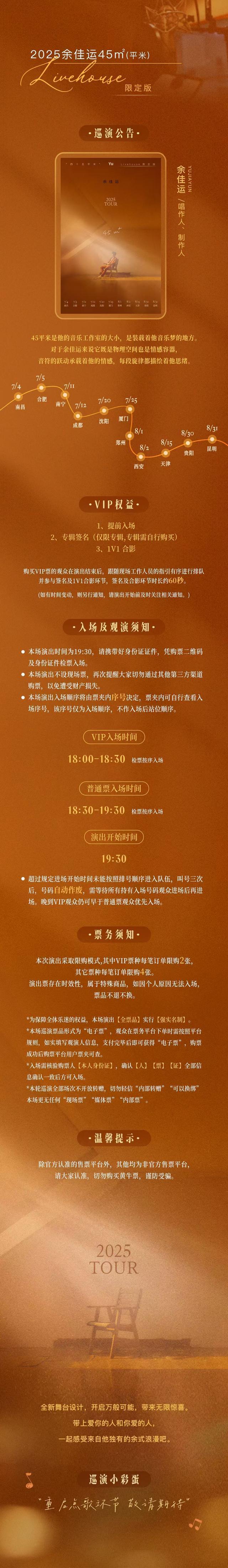 | 限购说明 | 每单限购6张 | 重复购票说明 | 同一位“实名观演人”请勿在多个售票平台重复购票,一位“实名观演人”的身份信息对应同场次的一张门票。 若同一位“实名观演人”被发现存在多个购票平台购买同场次行为,由该行为产生的无效重复订单、退票手续费、过期不可退票、无法入场等所有损失,均由购票人自行承担。 |