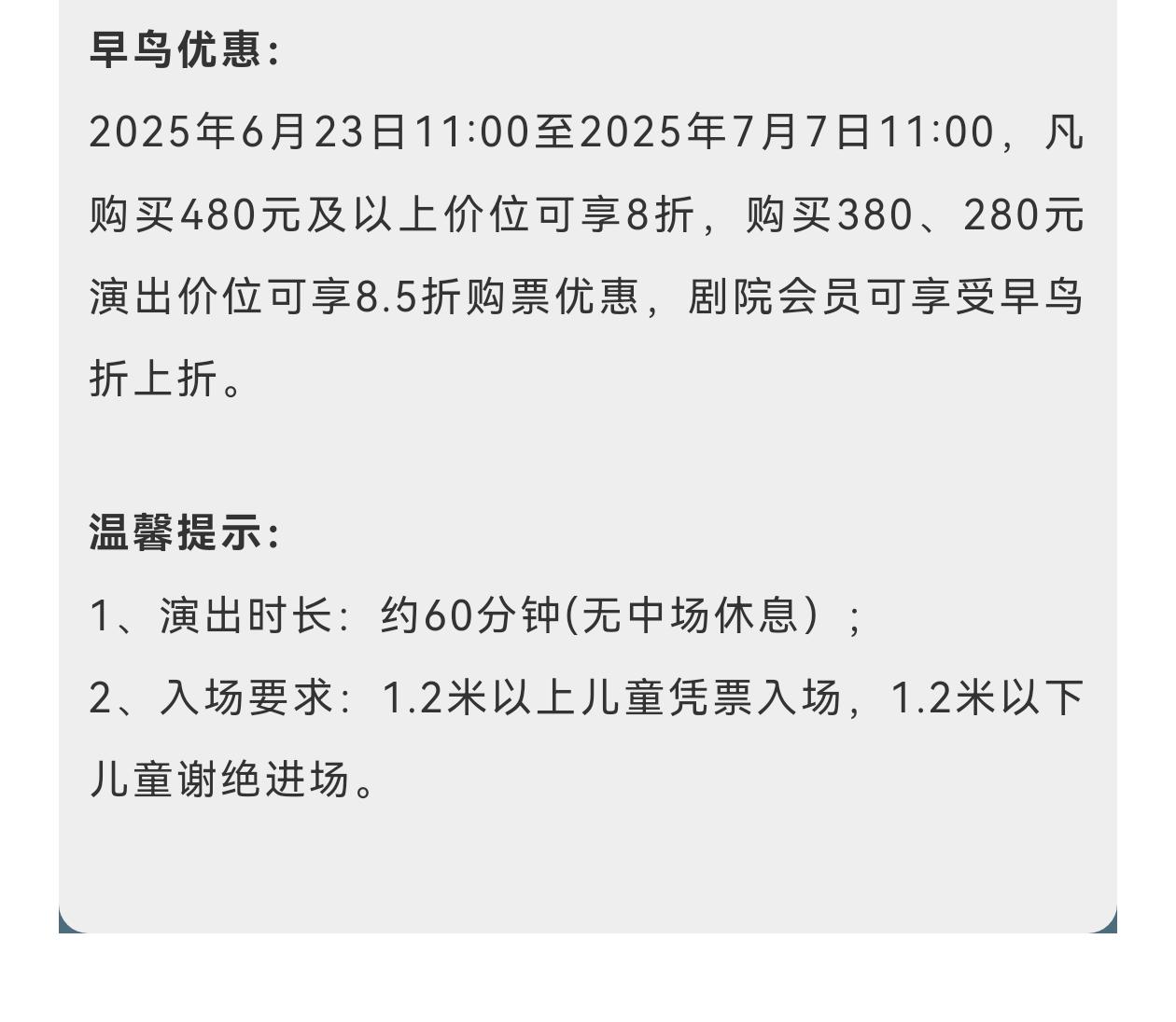| 座位类型 | 请按门票对应座位,有序对号入座 | 儿童入场提示 | 1.2米以上凭票入场,1.2米以下谢绝入场 |