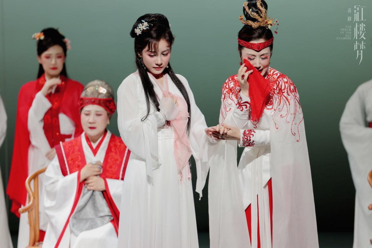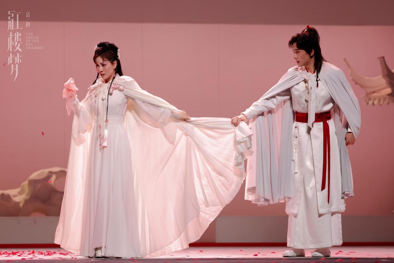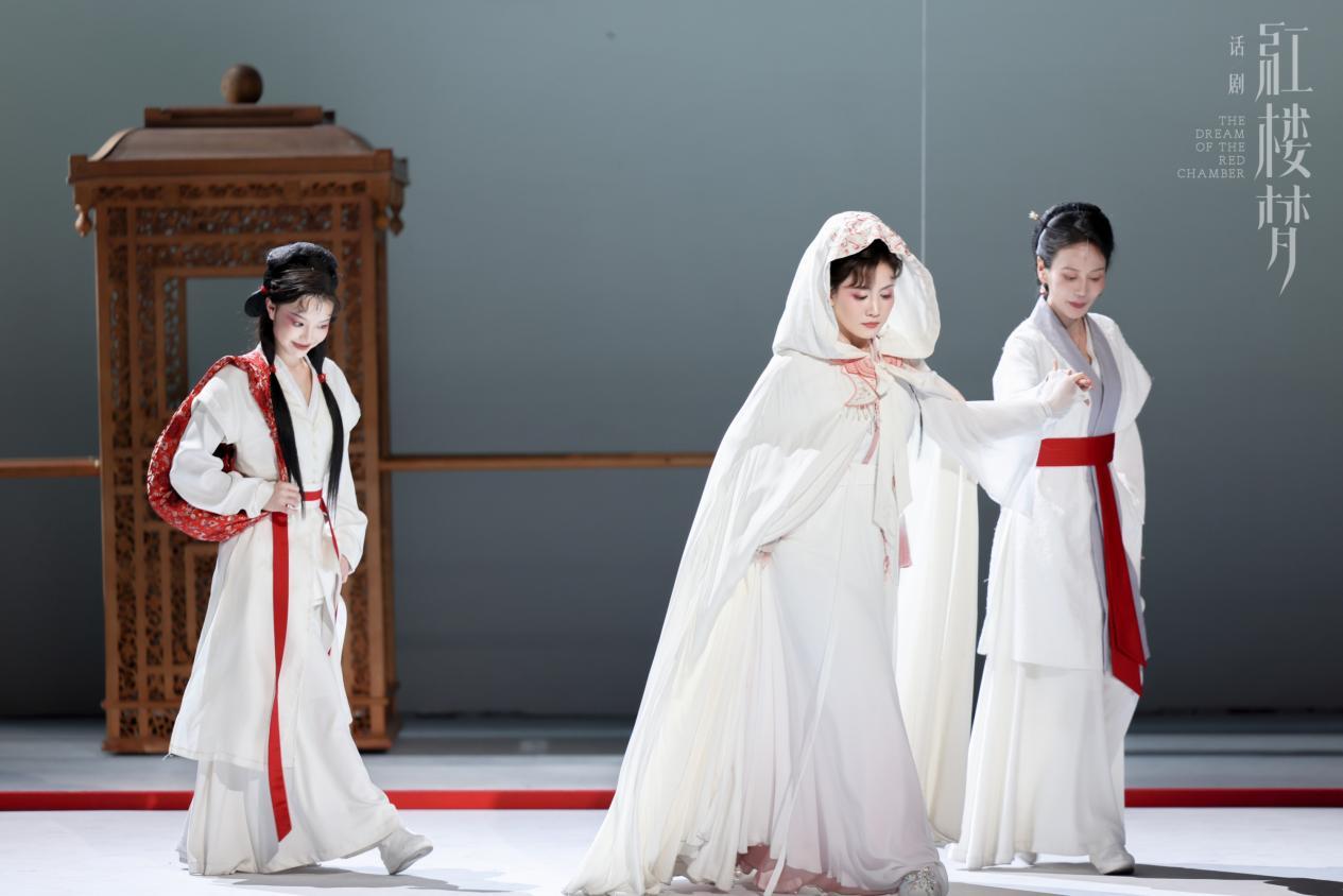 舞美设计师刘杏林打造的话剧《红楼梦》的舞台,有令人过目难忘的写意留白,极简且符合当代审美。刘杏林认为,在《红楼梦》中,“有”和“无”的概念特别重要,这个不仅仅是古代的一个家族的故事和命运,更是整个人类、整个世界的命运。他选用白色的结构盖在舞台上,打开就是大部分剧情发生的地点、表演的空间;结束合上以后,舞台又再次成了一块空白,暗示“落了片白茫茫大地真干净”。而且“红”在剧情发展的过程中不断地洒落,演员带着这些“落红”,整个舞台被碎的“落红”布满,这也跟黛玉的内心和女性角色的命运有了联系。《红楼梦》中“落了片白茫茫大地真干净”的说法,不仅是故事的结局,也意味着人世间有与无,好与了循环往复的始终。