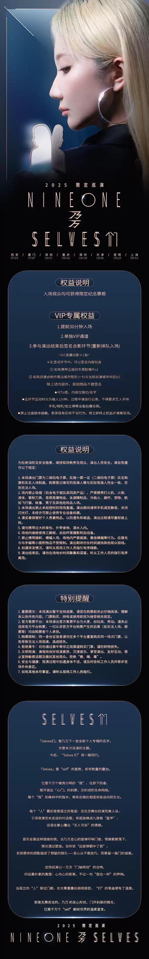 | 限购说明 | 每单限购4张 | 重复购票说明 | 同一位“实名观演人”请勿在多个售票平台重复购票,一位“实名观演人”的身份信息对应同场次的一张门票。 若同一位“实名观演人”被发现存在多个购票平台购买同场次行为,由该行为产生的无效重复订单、退票手续费、过期不可退票、无法入场等所有损失,均由购票人自行承担。 |