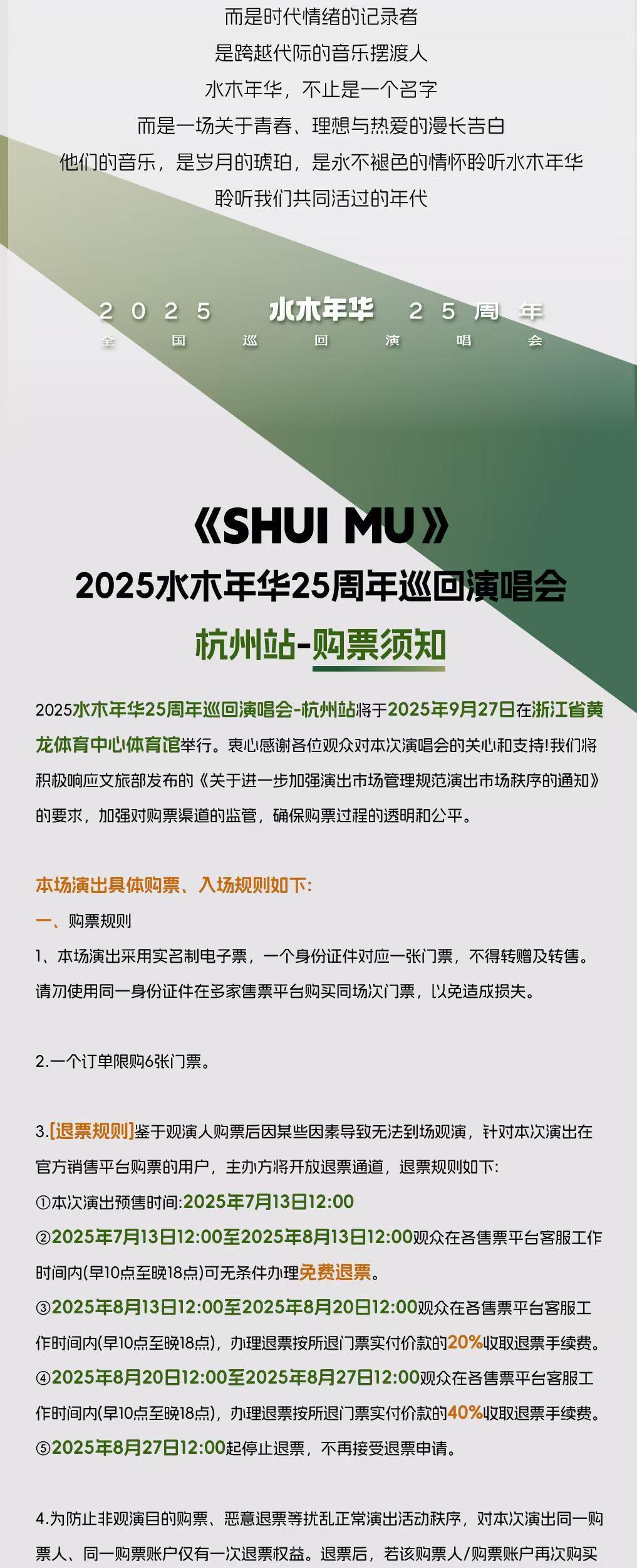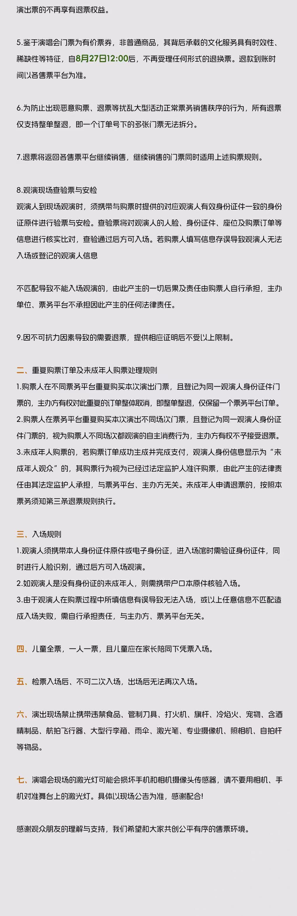 | 限购说明 | 每单限购6张 | 重复购票说明 | 同一位“实名观演人”请勿在多个售票平台重复购票,一位“实名观演人”的身份信息对应同场次的一张门票。 若同一位“实名观演人”被发现存在多个购票平台购买同场次行为,由该行为产生的无效重复订单、退票手续费、过期不可退票、无法入场等所有损失,均由购票人自行承担。 |