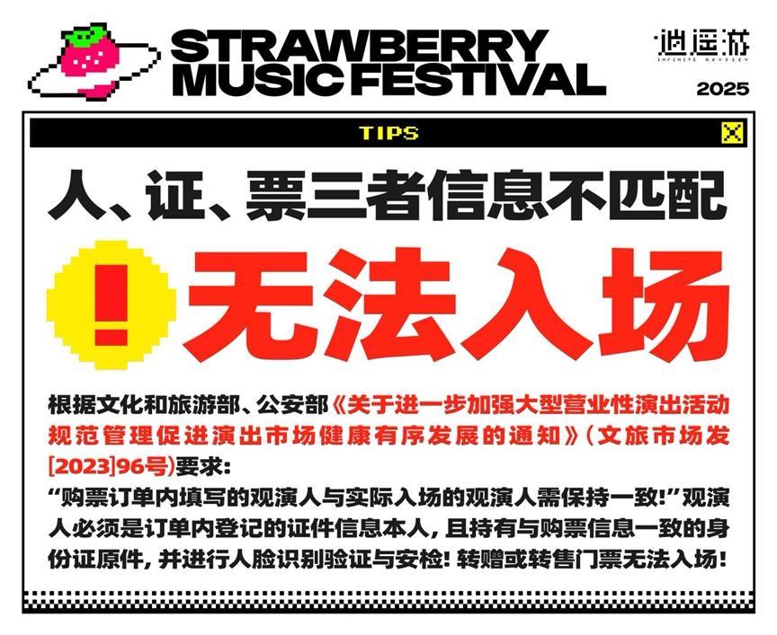 -音乐节现场请注意人身财产安全,文明观演,禁止乱扔垃圾,请自觉保护场地卫生环境,禁止翻越护栏等隔离设施,禁止向舞台投掷任何物品,演出结束后,请按照现场指引和工作人员引导有序退场,请勿拥挤、逗留。如遇紧急情况请立刻联系现场安保人员或前往乐迷服务中心寻求帮助。