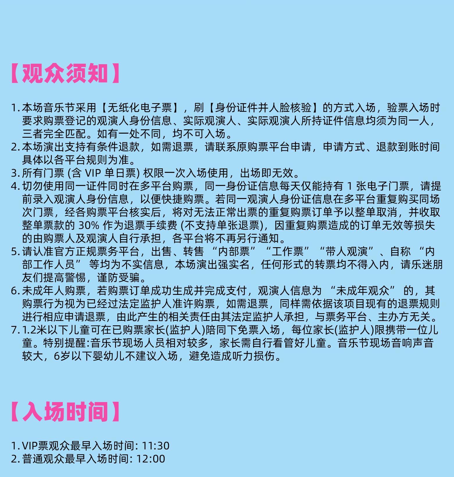 | 发票说明 | 如需开具发票,请在演出结束后一个月内联系客服并提供开票信息:票款发票由商家开具,平台服务费发票由票牛开具。 | 重要提示 | 演出现场气氛热烈,请您务必根据自身身体状况酌情是否购票参与观演,特别是患有心脏类疾病、急性心脑血管疾病、心肌炎、高血压等相关疾病的人群,请您务必遵照医嘱,结合病史及个人身体状况进行观演,观演期间请自行承担身体健康相关责任。 |