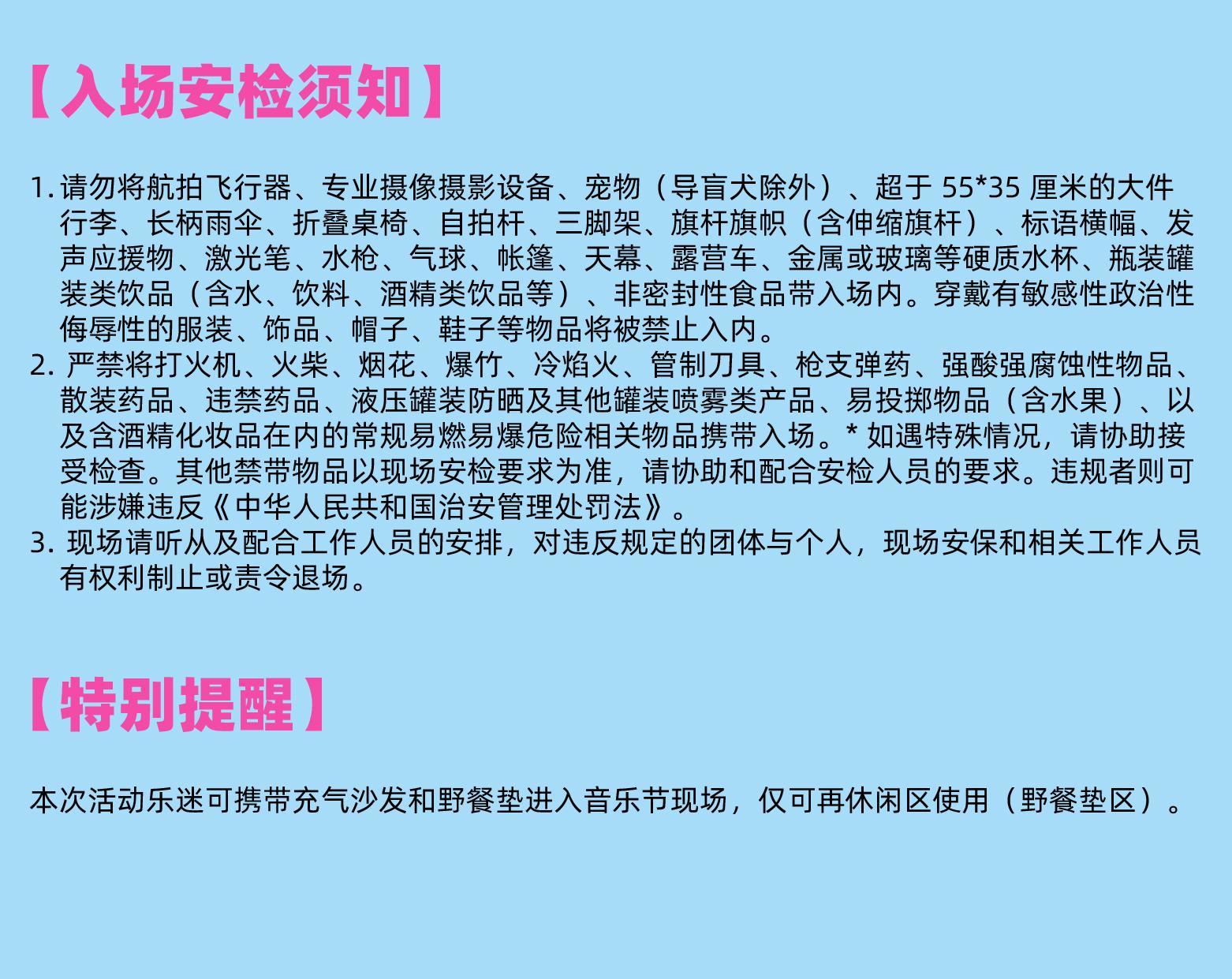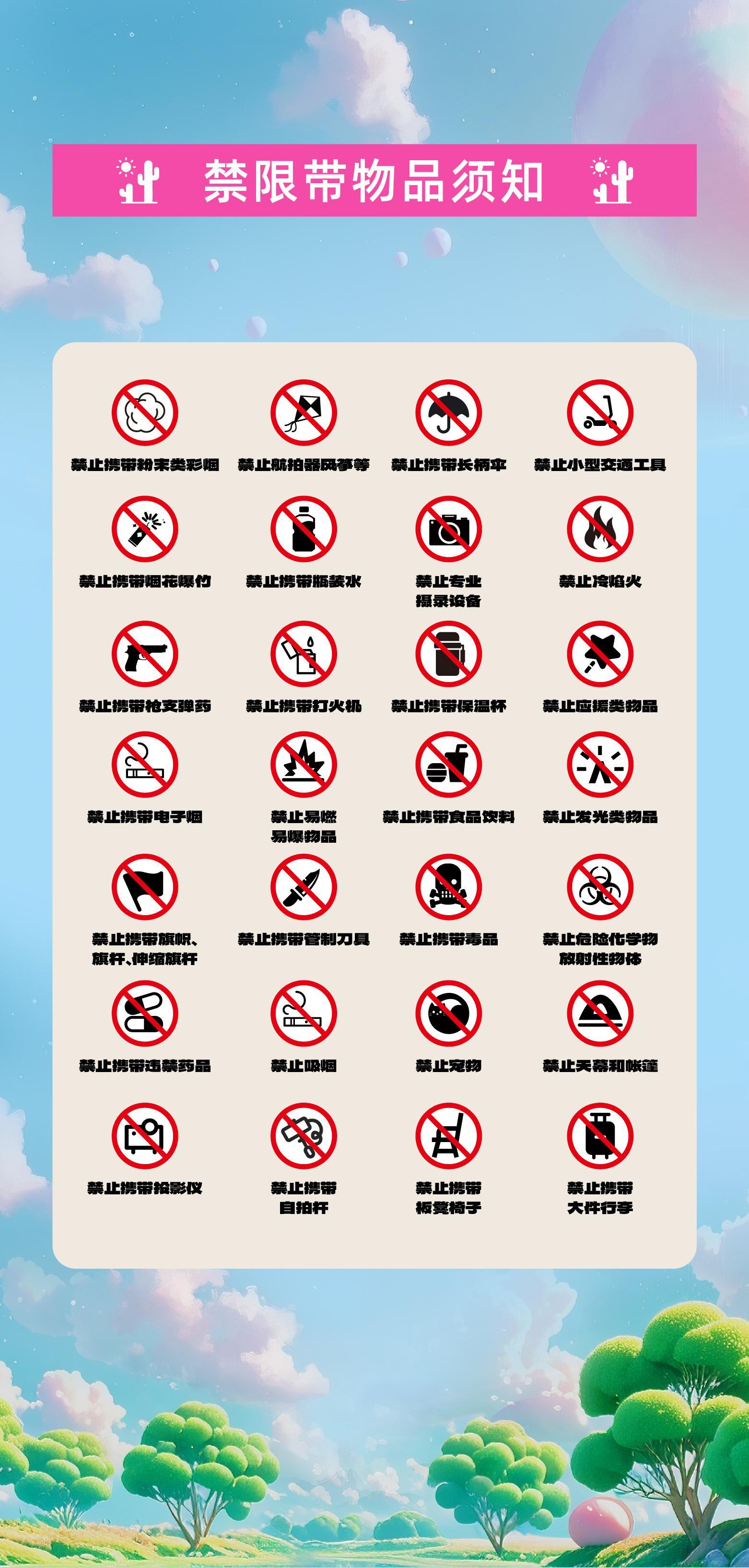 | 儿童入场提示 | 1.2米以上儿童凭票入场或者1.2米以下儿童免费入场 | 禁止携带物品 | 食品、饮料、相机、充电宝、打火机等 |