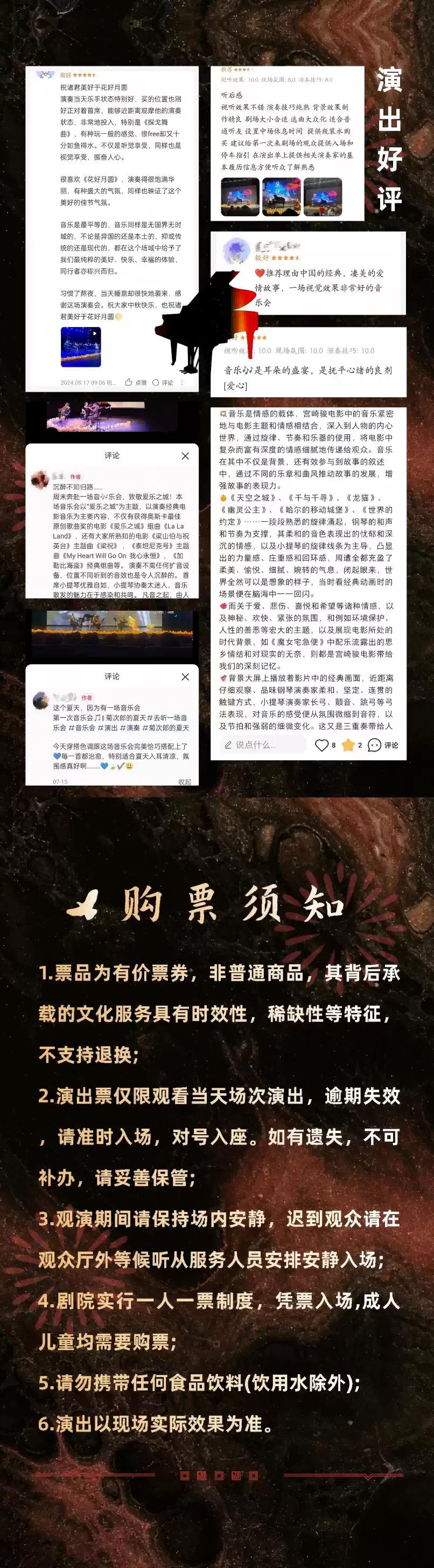 | 重要提示 | 演出现场气氛热烈,请您务必根据自身身体状况酌情是否购票参与观演,特别是患有心脏类疾病、急性心脑血管疾病、心肌炎、高血压等相关疾病的人群,请您务必遵照医嘱,结合病史及个人身体状况进行观演,观演期间请自行承担身体健康相关责任。 | 温馨提示 | 购买前请您提前规划好行程,做好相应准备,以免影响您的正常观演,感谢您的理解和配合。 若演出受不可抗力影响延期或取消,票牛将对演出票订单按照项目官方通知方案进行处理,其他因观演发生的费用需由您自行承担。 |