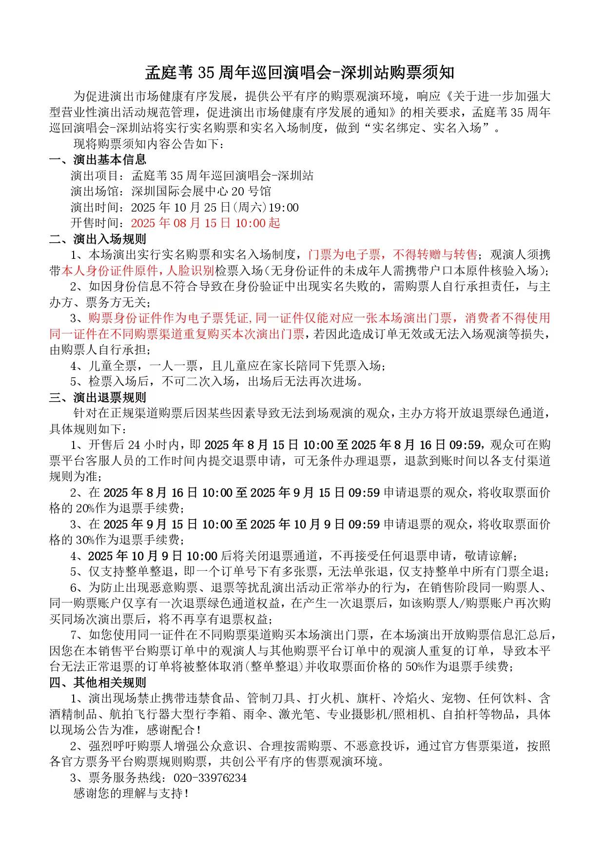 | 限购说明 | 每单限购6张 | 重复购票说明 | 同一位“实名观演人”请勿在多个售票平台重复购票,一位“实名观演人”的身份信息对应同场次的一张门票。 若同一位“实名观演人”被发现存在多个购票平台购买同场次行为,由该行为产生的无效重复订单、退票手续费、过期不可退票、无法入场等所有损失,均由购票人自行承担。 |