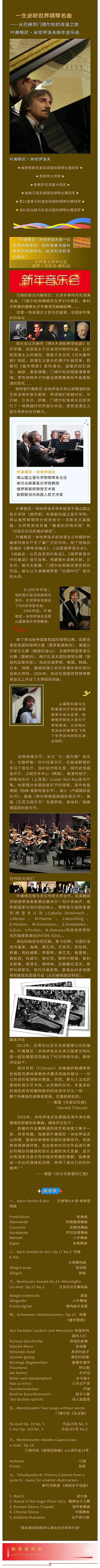 5、本场演出全场严禁拍照摄影摄像,请将手机调至静音或飞行模式,乐章间请勿鼓掌。