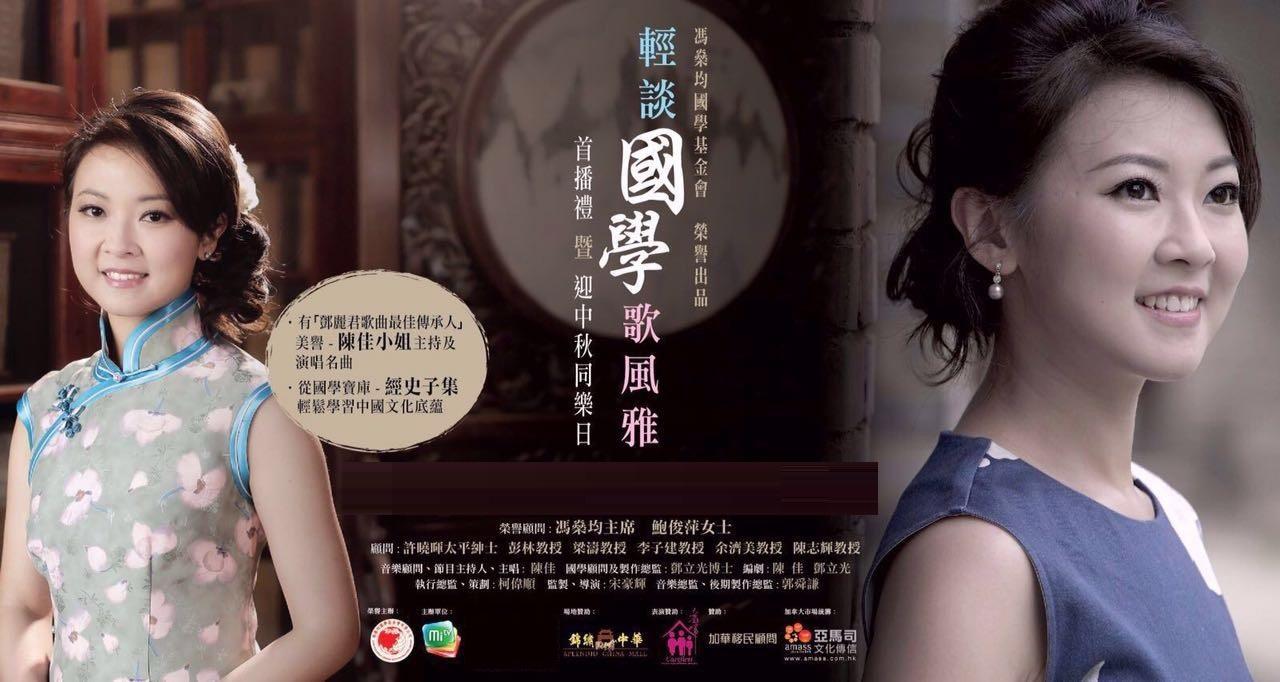 2016年起,陈佳凭借个人的文学修养和温婉高雅的书卷气质,被香港冯燊均国学基金会聘请为顾问,并在基金会推出的一系列国学节目《轻谈国学歌风雅》中担任主持人、撰稿人、音乐总监,用说与唱结合的方式传承优秀中华文化。