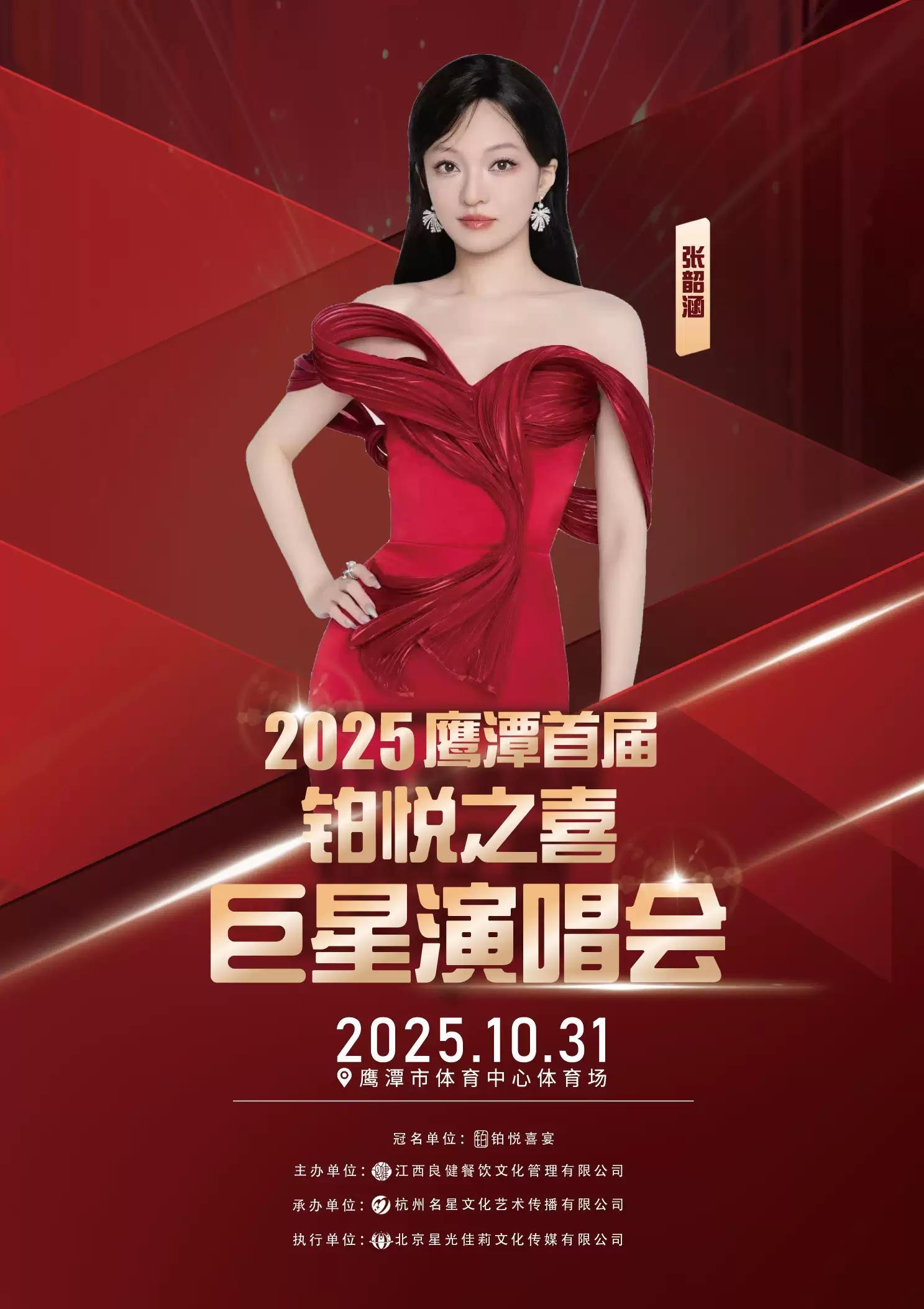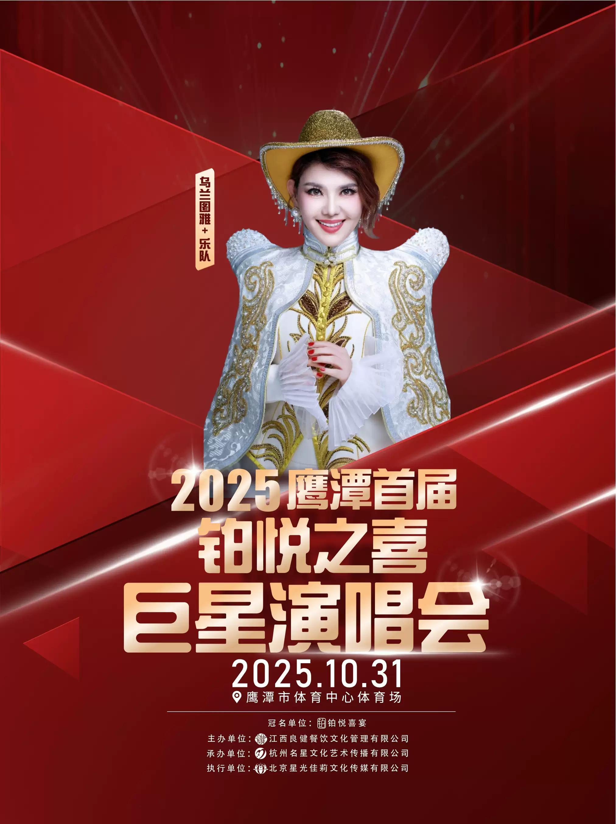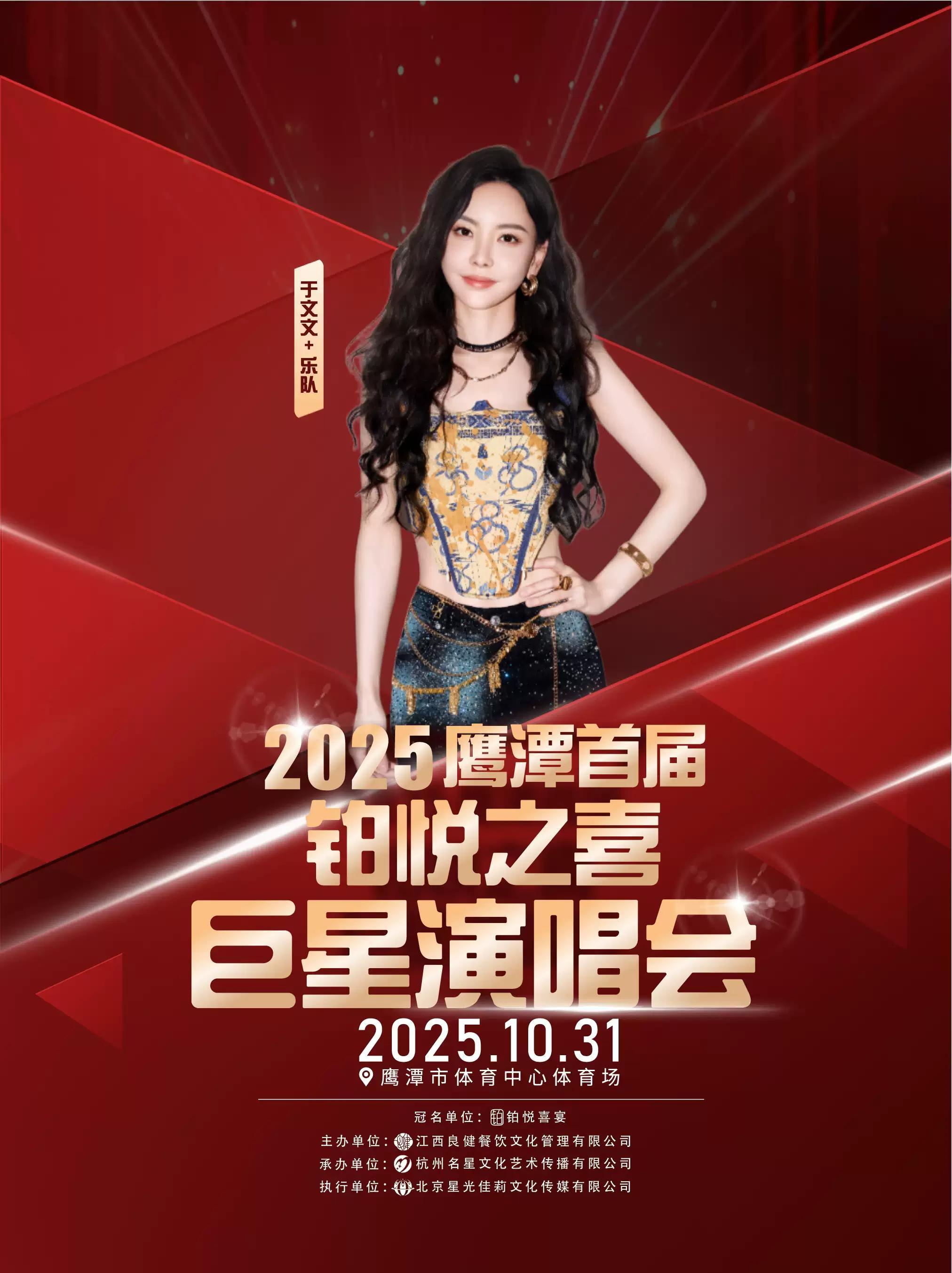 “人生四喜·尽在铂悦“2025鹰潭首届铂悦之喜巨星演唱会于10月31日在鹰潭市体育中心体育场举办,活动主办方有幸邀请到亚洲天后张韶涵、歌王杨宗纬、流量明星影视歌手于文文、蒙古天后乌兰图雅等空降鹰潭,本场演唱会将以一流的音响、璀璨的灯光,绚丽的舞台呈现给大家将是一种新的视觉盛宴,机会难得,不容错过!