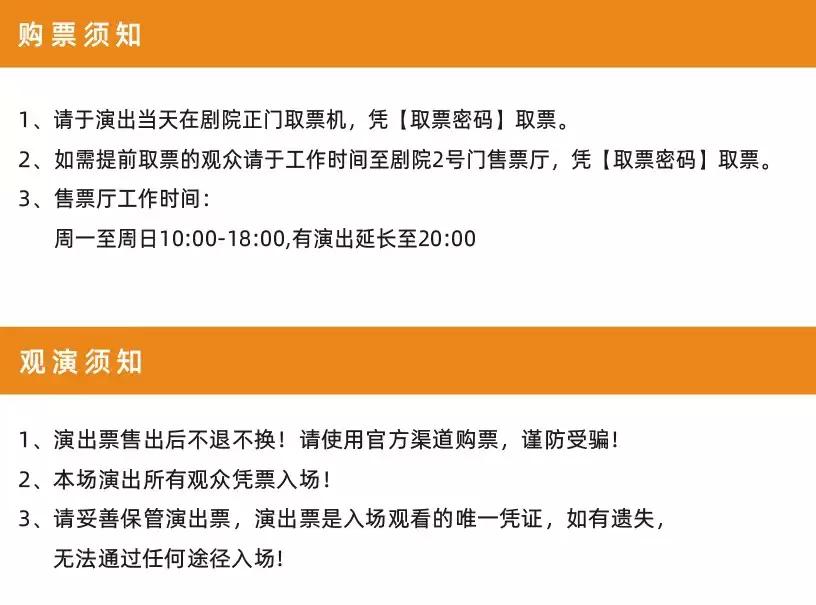 | 温馨提示 | 购买前请您提前规划好行程,做好相应准备,以免影响您的正常观演,感谢您的理解和配合。 若演出受不可抗力影响延期或取消,票牛将对演出票订单按照项目官方通知方案进行处理,其他因观演发生的费用需由您自行承担。 | 电子票 | 本项目支持凭电子票入场。 -请至少提前一天购买,开演前24小时内,票牛会发送取票短信,请按短信提示内容取票。 |
