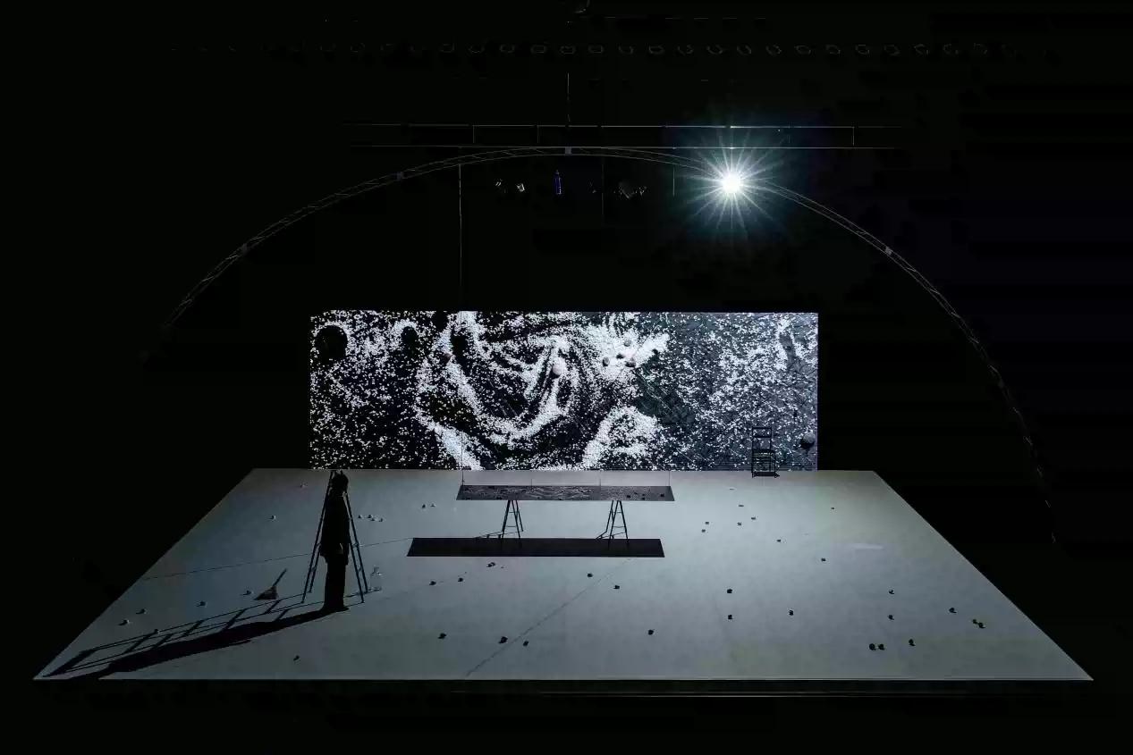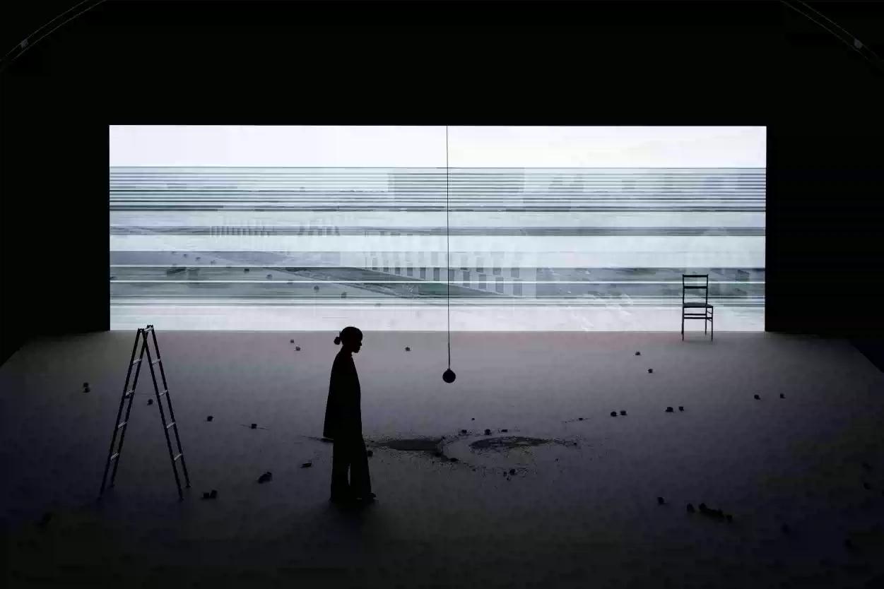 作品以“阈限空间”为主题,深刻探讨了现实与超现实之间的感知边界。作品使用了18.4声道全景声系统以及钟摆音频反馈装置,与表演者的声音形成节奏反馈回路。通过精密的光影与声场设计,艺术家在剧场中构建了一个过渡性的感知空间,巧妙地将自然界的临界现象——如黎明与黄昏的光影交替——转化为独特的艺术语言。