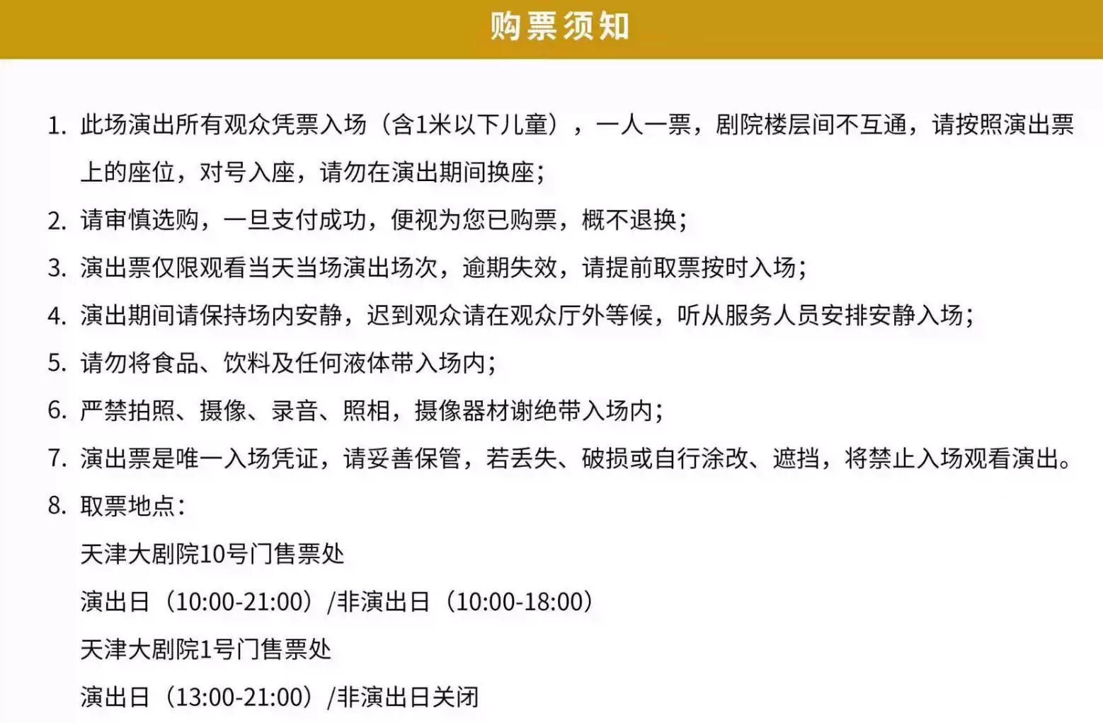 | 重要提示 | 演出现场气氛热烈,请您务必根据自身身体状况酌情是否购票参与观演,特别是患有心脏类疾病、急性心脑血管疾病、心肌炎、高血压等相关疾病的人群,请您务必遵照医嘱,结合病史及个人身体状况进行观演,观演期间请自行承担身体健康相关责任。 | 温馨提示 | 购买前请您提前规划好行程,做好相应准备,以免影响您的正常观演,感谢您的理解和配合。 若演出受不可抗力影响延期或取消,票牛将对演出票订单按照项目官方通知方案进行处理,其他因观演发生的费用需由您自行承担。 |
