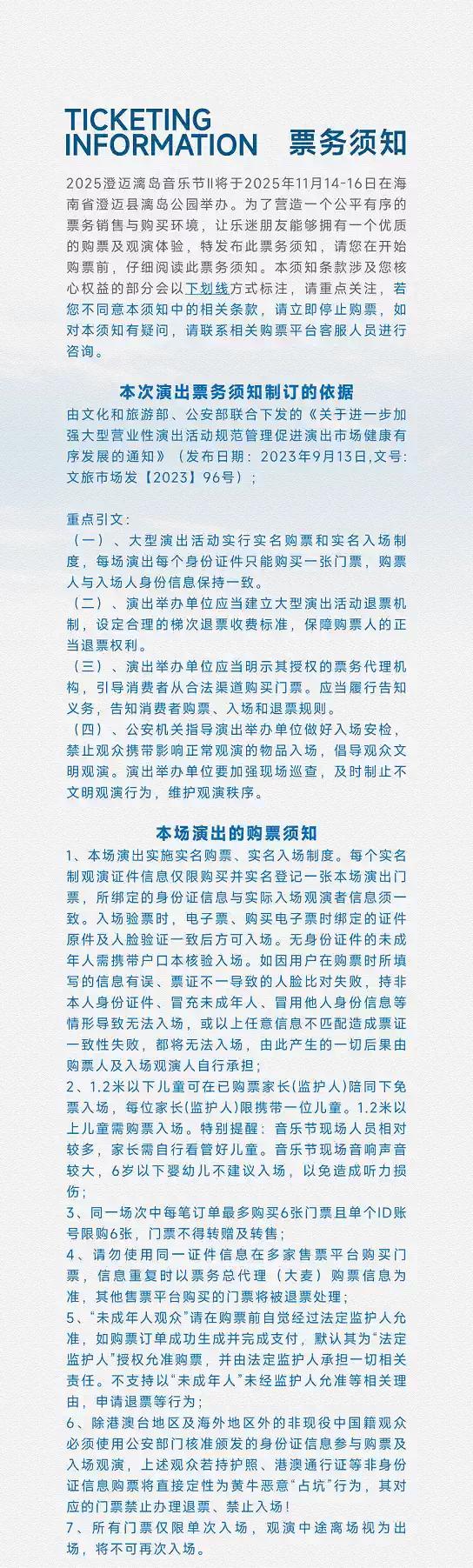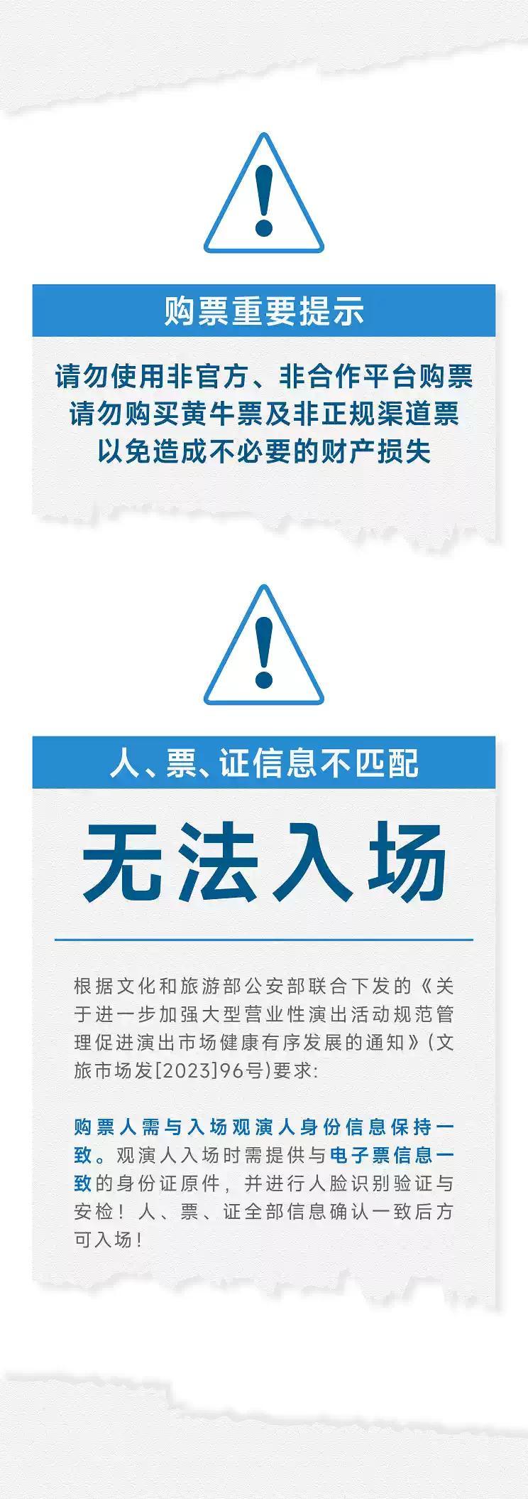| 限购说明 | 每单限购6张 | 重复购票说明 | 同一位“实名观演人”请勿在多个售票平台重复购票,一位“实名观演人”的身份信息对应同场次的一张门票。 若同一位“实名观演人”被发现存在多个购票平台购买同场次行为,由该行为产生的无效重复订单、退票手续费、过期不可退票、无法入场等所有损失,均由购票人自行承担。 |