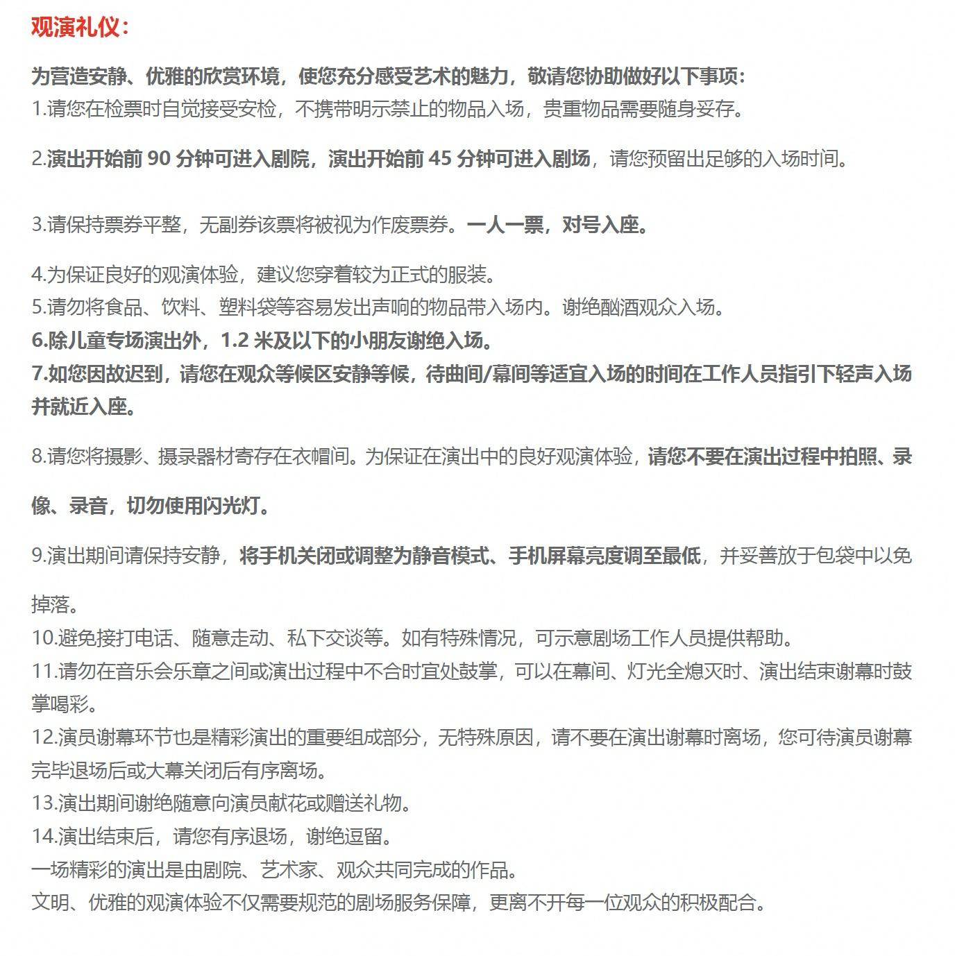 | 座位类型 | 请按门票对应座位,有序对号入座 | 儿童入场提示 | 1.2米以上凭票入场,1.2米以下谢绝入场 |