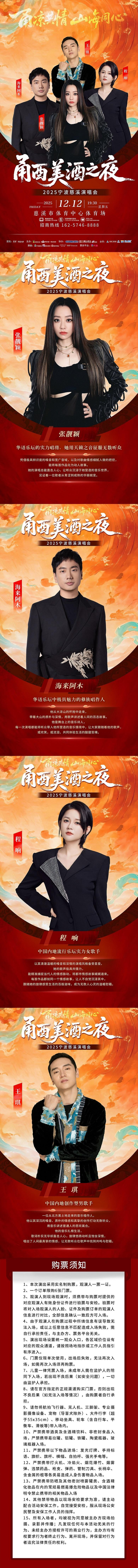 | 限购说明 | 每单限购6张 | 重复购票说明 | 同一位“实名观演人”请勿在多个售票平台重复购票,一位“实名观演人”的身份信息对应同场次的一张门票。 若同一位“实名观演人”被发现存在多个购票平台购买同场次行为,由该行为产生的无效重复订单、退票手续费、过期不可退票、无法入场等所有损失,均由购票人自行承担。 |