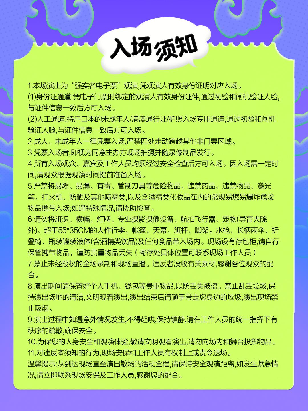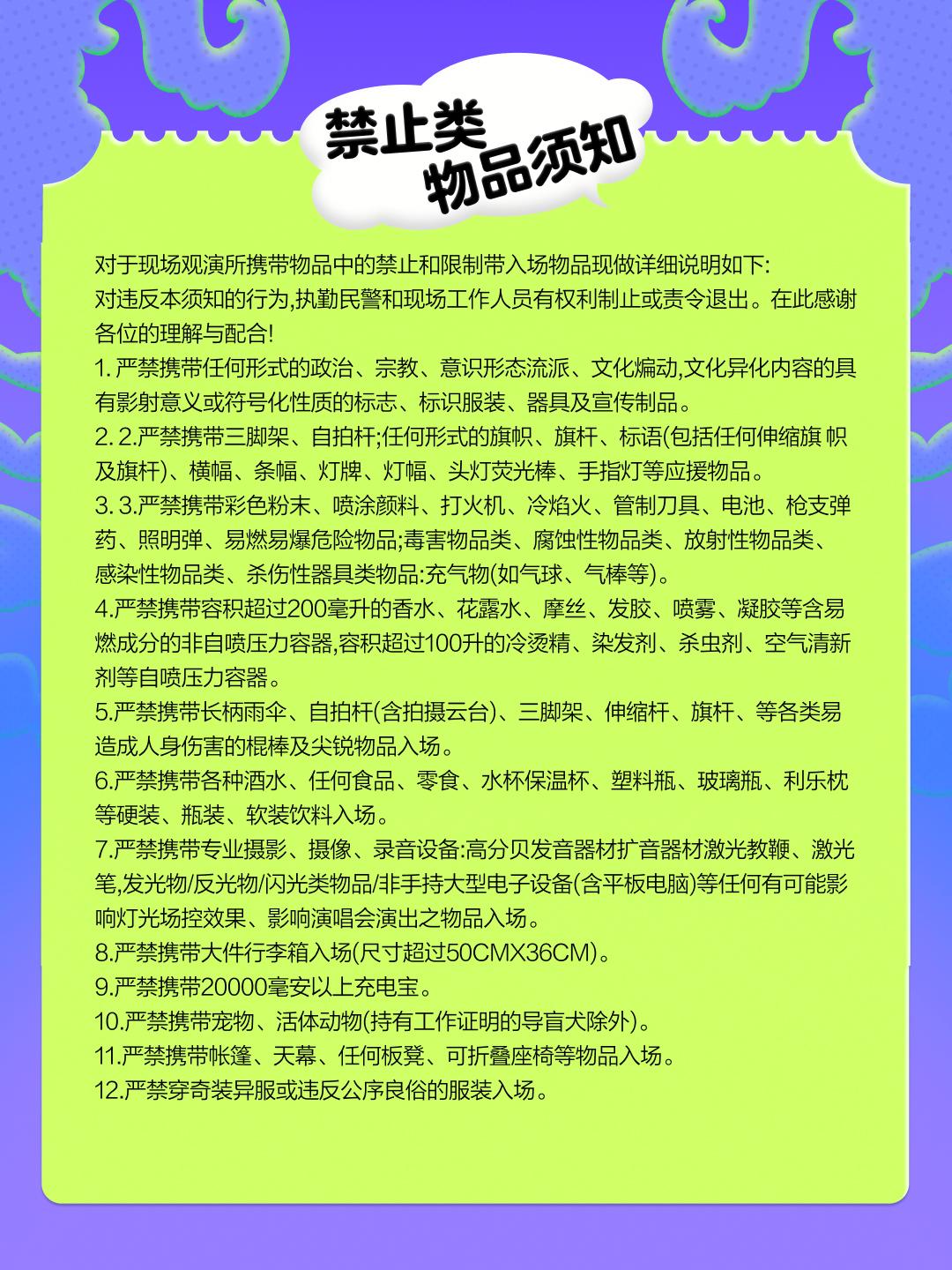 | 儿童入场提示 | 1.2米以上凭票入场,1.2米以下谢绝入场 | 禁止携带物品 | 食品、饮料、相机、充电宝、打火机等 |
