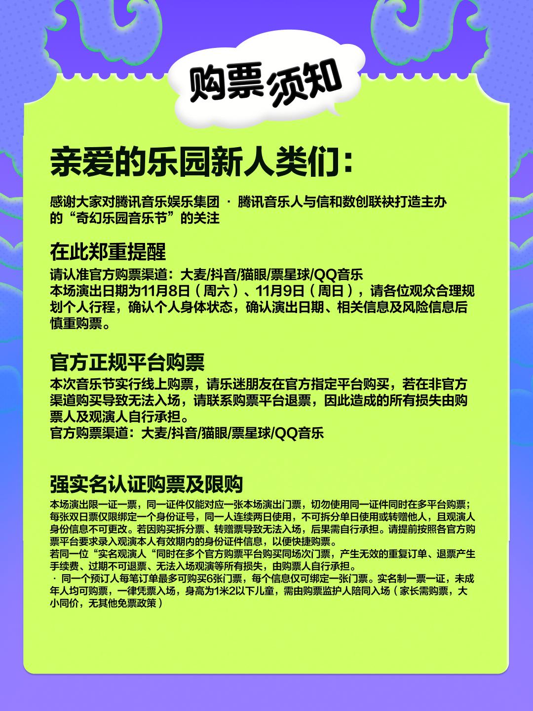 | 限购说明 | 每单限购6张 | 重复购票说明 | 同一位“实名观演人”请勿在多个售票平台重复购票,一位“实名观演人”的身份信息对应同场次的一张门票。 若同一位“实名观演人”被发现存在多个购票平台购买同场次行为,由该行为产生的无效重复订单、退票手续费、过期不可退票、无法入场等所有损失,均由购票人自行承担。 |