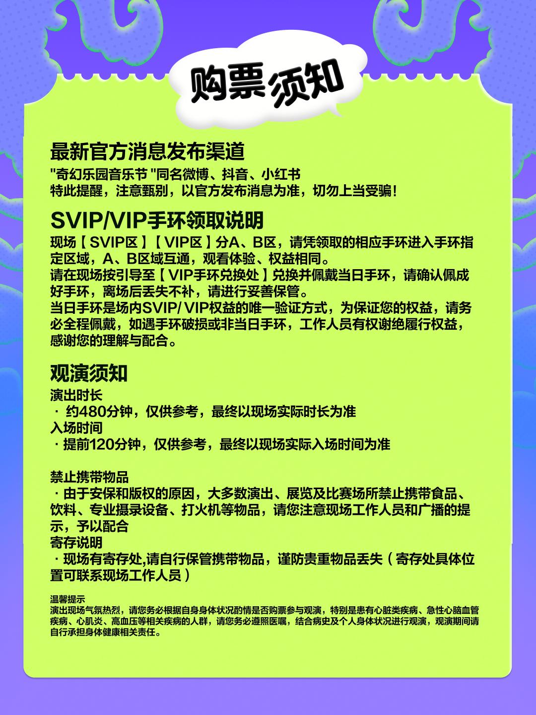 | 发票说明 | 如需开具发票,请在演出结束后一个月内联系客服并提供开票信息:票款发票由商家开具,平台服务费发票由票牛开具。 | 重要提示 | 演出现场气氛热烈,请您务必根据自身身体状况酌情是否购票参与观演,特别是患有心脏类疾病、急性心脑血管疾病、心肌炎、高血压等相关疾病的人群,请您务必遵照医嘱,结合病史及个人身体状况进行观演,观演期间请自行承担身体健康相关责任。 |