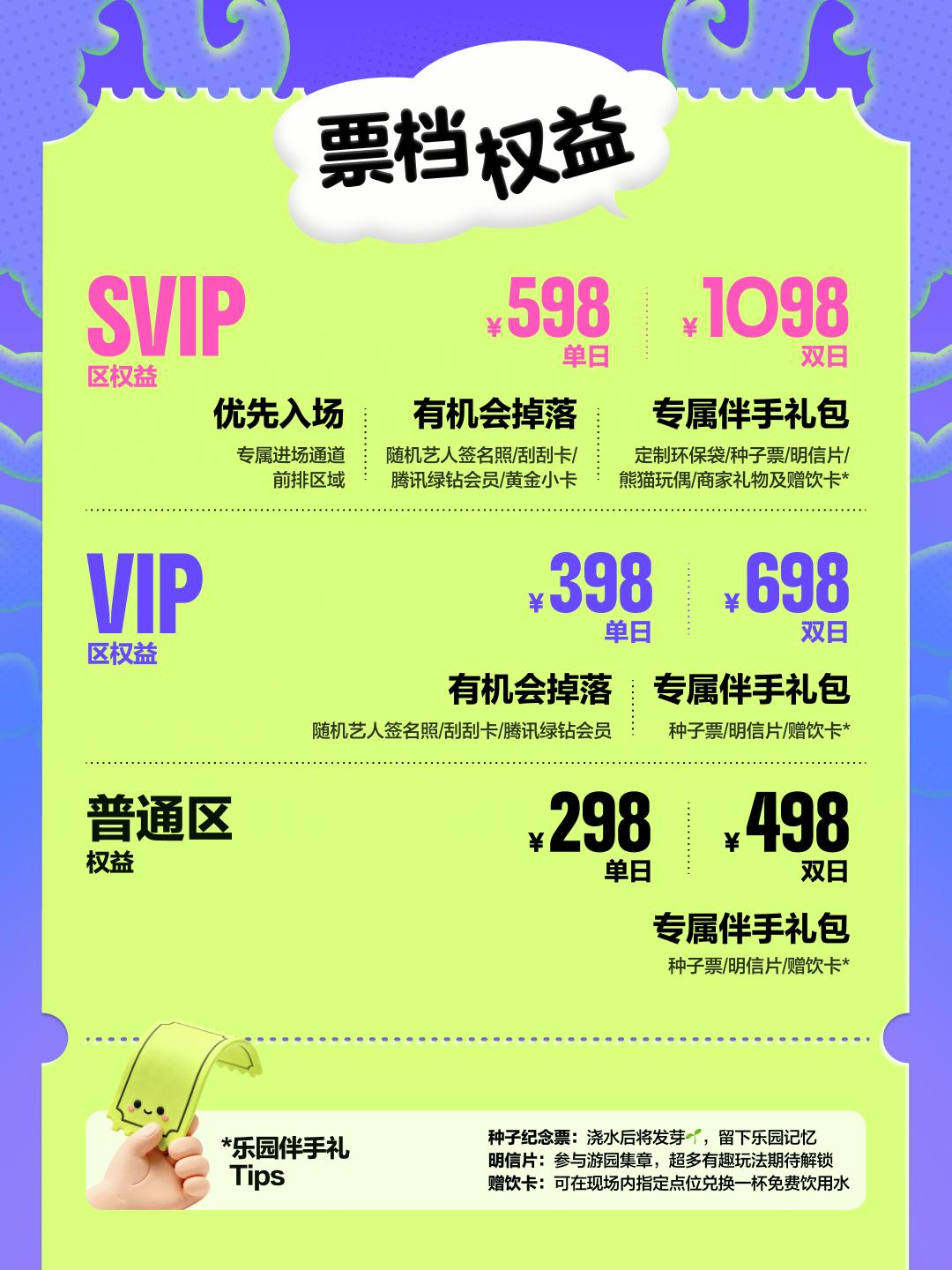 | 服务费说明 | 为了给您提供便利的在线购票服务,票牛为此投入大量的平台技术支持、运营维护支持,并联合平台入驻商家、第三方在线支付服务商、第三方合作商等合作方为您提供服务,基于前述平台成本及合作方服务费用,票牛向您收取不超过票款5%的平台服务费(最高不超过400元)。 票牛收取的平台服务费,主要可能包括如下内容:1.票牛的线上平台和软件系统开发维护成本。2.支付宝、微信等第三方支付服务商收取的支付手续费用。3.物流公司收取的票品寄送费用(如纸质票)。4.客户服务成本以及短信、电话等通道费用。5.为用户提供购票保障服务对应的运营与管理成本。6.其它为完成用户订单必须的相关服务成本、人员成本等。 | 座位类型 | 请按门票对应座位,有序对号入座 |