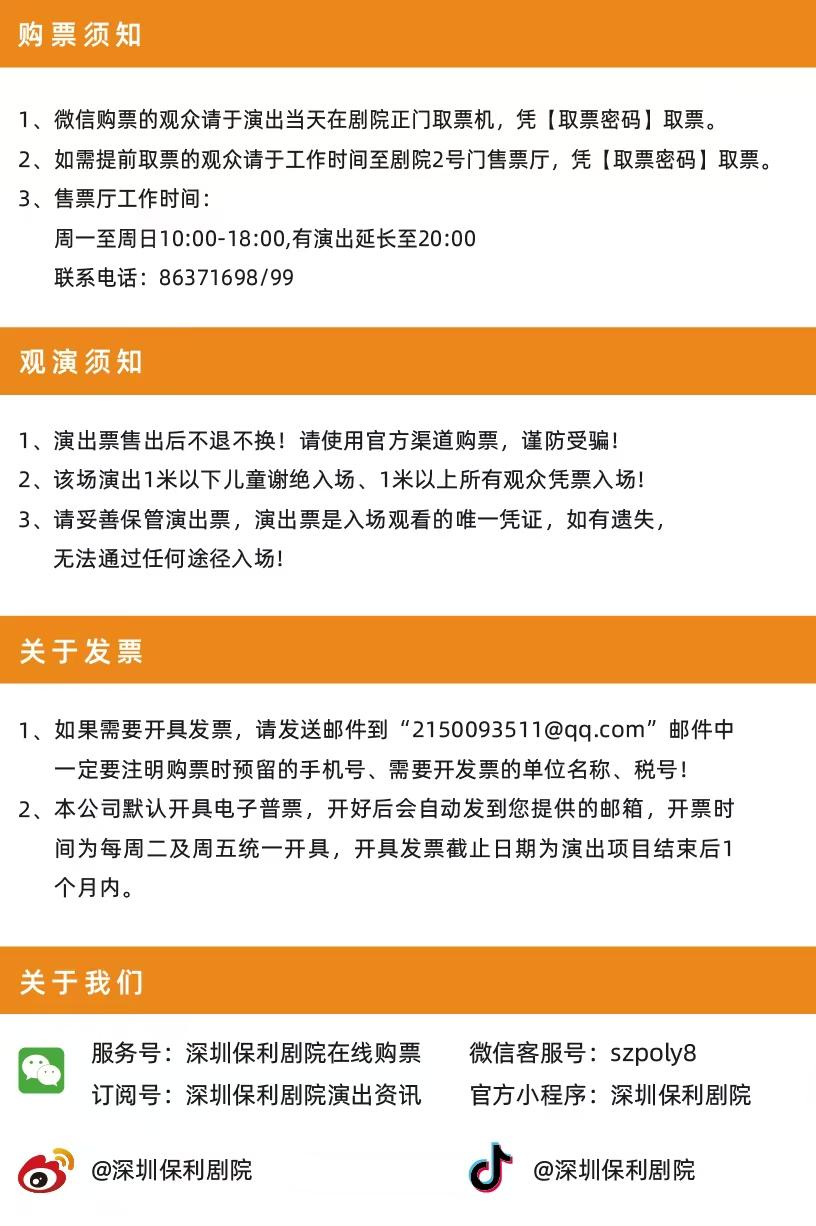 | 禁止携带物品 | 食品、饮料、相机、充电宝、打火机等 | 发票说明 | 如需开具发票,请在演出结束后一个月内联系客服并提供开票信息:票款发票由商家开具,平台服务费发票由票牛开具。 |