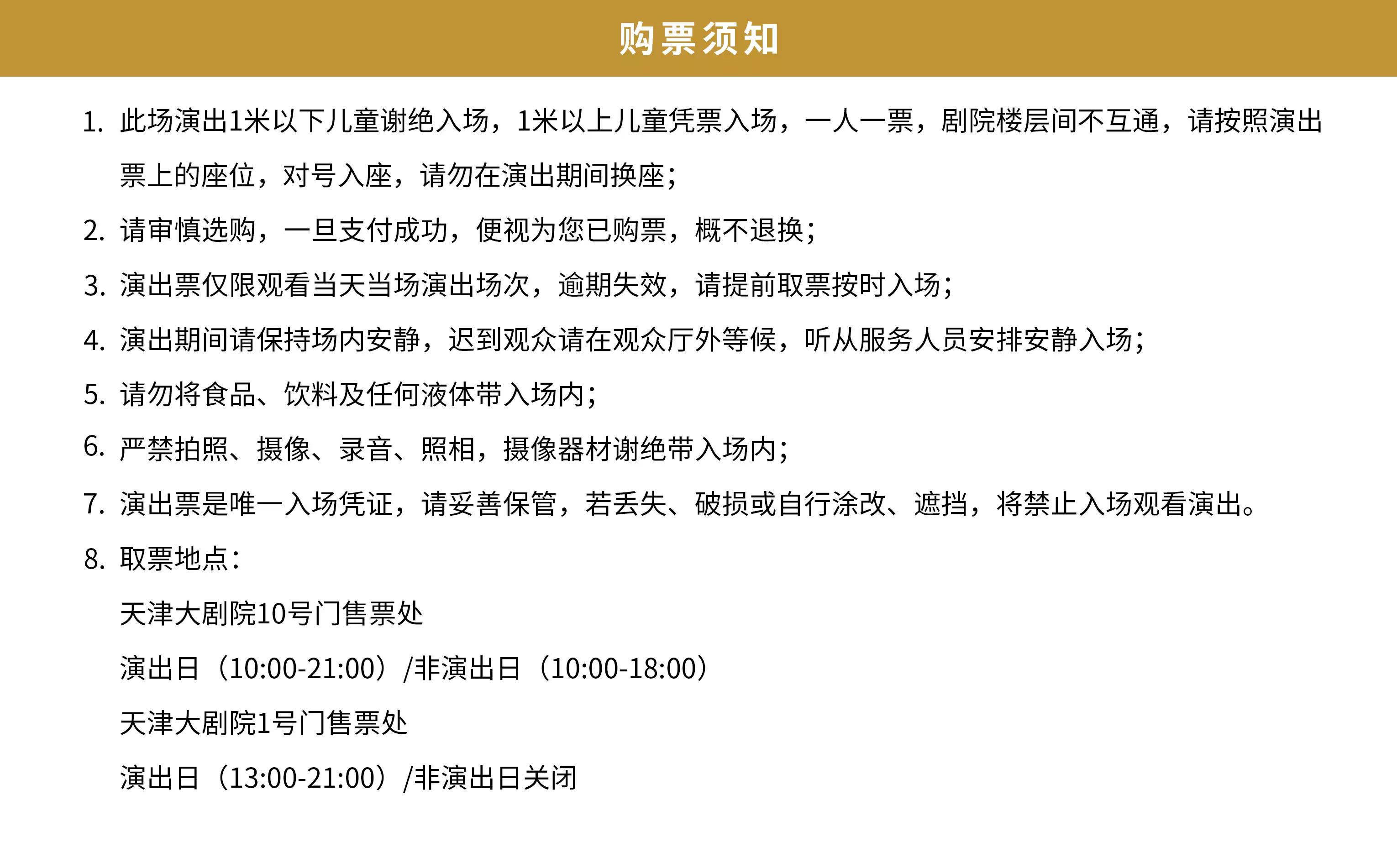 | 座位类型 | 请按门票对应座位,有序对号入座 | 儿童入场提示 | 1米以上凭成人票入场,1米以下谢绝入场 |