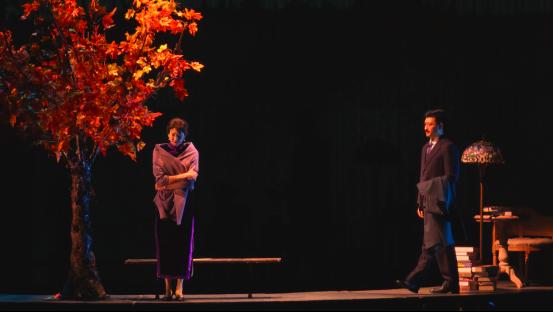 当舞台上另一层架高了的铁台轮转起来时,《半生缘》里的顾曼桢与沈世钧在大雪纷飞里断了联系,那一封封寄出的信件变成一片片洒满舞台的雪花,满目凄迷;《红玫瑰与白玫瑰》里的佟振保拿着苹果,与王娇蕊眉目留情;《小团圆》里的盛久莉与邵之雍在琉璃灯前签下一纸婚约,“愿使岁月静好,现世安稳”……